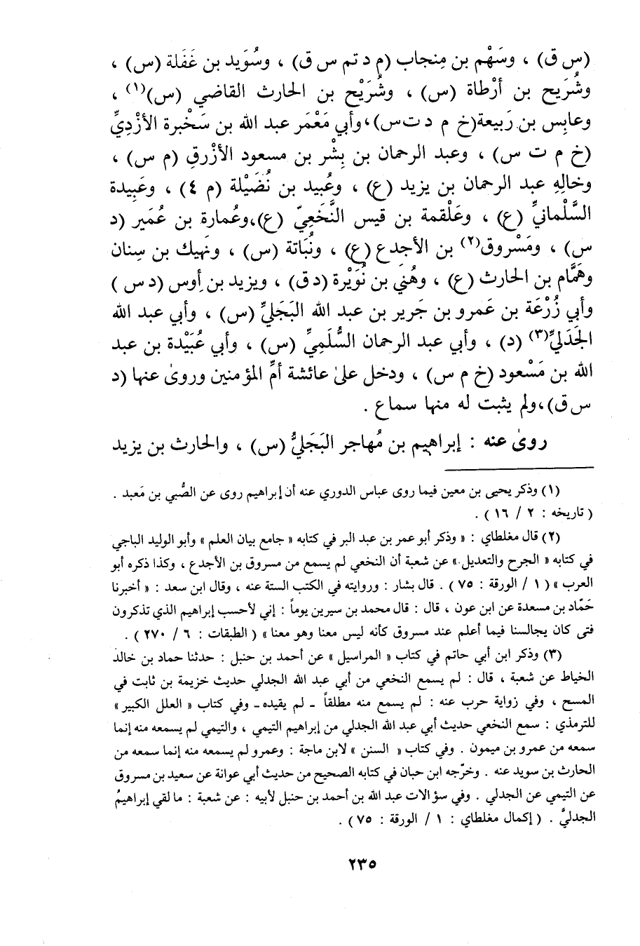 (2) قال مغلطاي: وذكر أبو عُمَر بن عَبد الْبَرِّ في كتابه"جامع بيان العلم"وأبو الوليد الباجي في كتابه"الجرح والتعديل"عن شعبة أن النخعي لم يسمع من مسروق بن الاجدع، وكذا ذكره أبو العرب" (1 / الورقة: 75) . قال بشار: وروايته في الكتب الستة عنه، وَقَال ابن سعد: أخبرنا حماد بْن مسعدة عن ابن عون، قال: قال محمد بن سيرين يوما: إني لاحسب إبراهيم الذي تذكرون فتى كان يجالسنا فيما أعلم عند مسروق كأنه ليس معنا وهو معنا" (الطبقات: 6 / 270) .