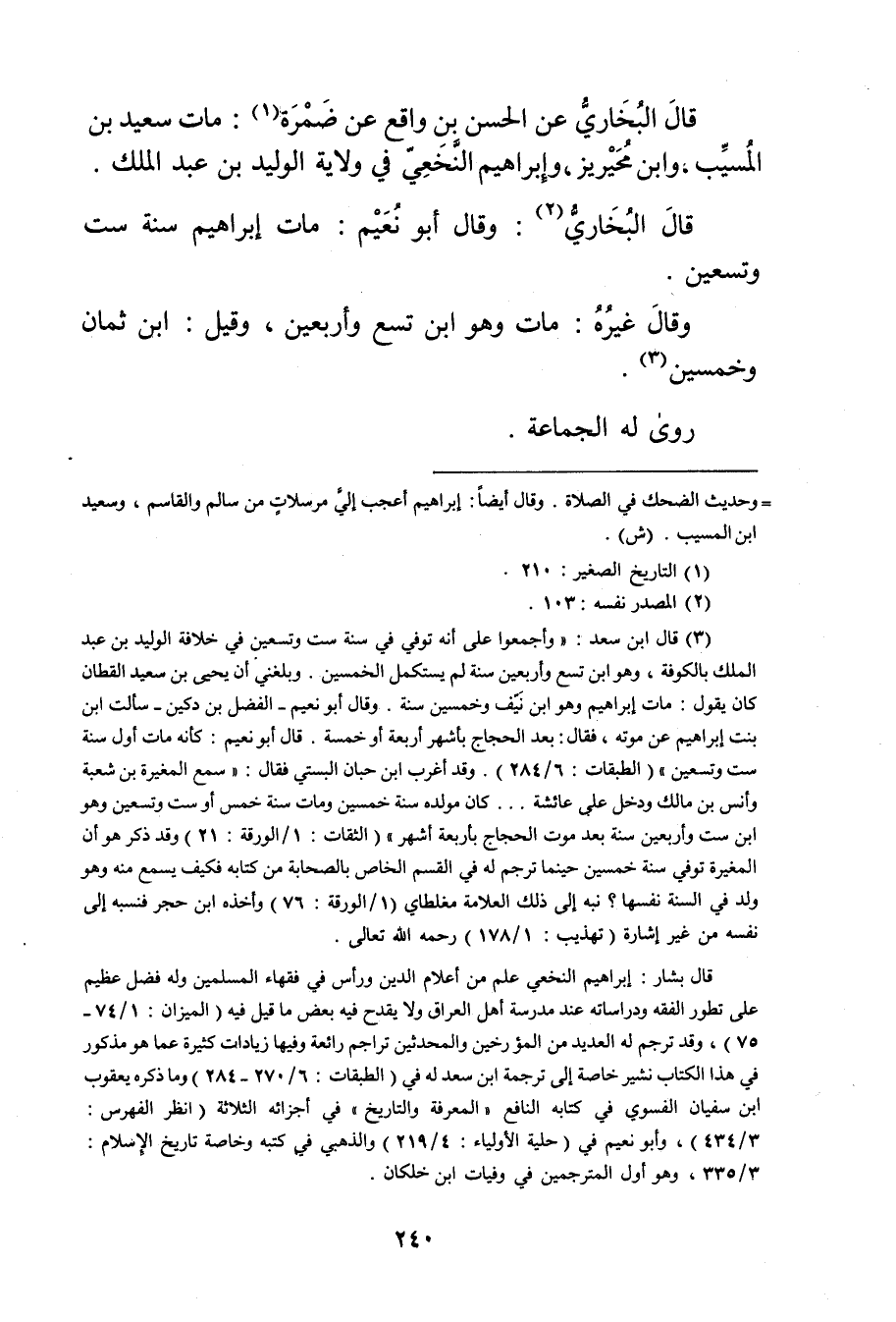 (3) قال ابن سعد: وأجمعوا على أنه توفي سنة ست وتسعين في خلافة الوليد بْن عبد الملك بالكوفة، وهو ابن تسع وأربعين سنة لم يستكمل الخمسين. وبلغني أن يحيى بن سَعِيد القطان كان يقول: مات إبراهيم وهو ابن نيف وخمسين سنة. وَقَال أبو نعيم - الفضل بن دكين - سألت ابن بنت إبراهيم عن موته، فقال: بعد الحجاج بأشهر أربعة أو خمسة. قال أبو نعيم: كأنه مات أول سنة ست وتسعين" (الطبقات: 6 / 284) . وقد أغرب ابن حبان البستي فقال: سمع المغيرة بن شعبة وأنس بن مالك ودخل على عائشة..كان مولده سنة خمسين ومات سنة خمس أو ست وتسعين وهو ابن ست وأربعين سنة بعد موت الحجاج بأربعة أشهر" (الثقات: 1 / الورقة: 21) وقد ذكر هو أن المغيرة توفي سنة خمسين حينما ترجم له في القسم الخاص بالصحابة من كتابه فكيف يسمع منه وهو ولد في السنة نفسها؟ نبه إلى ذلك العلامة مغلطاي (1 / الورقة: 76) وأخذه ابن حجر فنسبه إلى نفسه من غير إشارة (تهذيب: 1 / 178) رحمه الله تعالى. قال بشار: إبراهيم النخعي علم من أعلام الدين ورأس في فقهاء المسلمين وله فضل عظيم على تطور الفقه ودراساته عند مدرسة أهل العراق ولا يقدح فيه بعض ما قيل فيه (الميزان: 1 / 74 - 75) ، وقد ترجم له العديد من المؤرخين والمحدثين تراجم رائعة وفيها زيادات كثيرة عما هو مذكور في هذا الكتاب نشير خاصة إلى ترجمة ابن سعد له في (الطبقات: 6 / 270 - 284) وما ذكره يعقوب ابن سفيان الفسوي في كتابه النافع"المعرفة والتاريخ"في أجزائه الثلاثة (انظر الفهرس: 3 / 434) ، وأبو نعيم في (حلية الاولياء: 4 / 219) والذهبي في كتبه وخاصة تاريخ الاسلام: 3 / 335، وهو أول المترجمين في وفيات ابن خلكان.