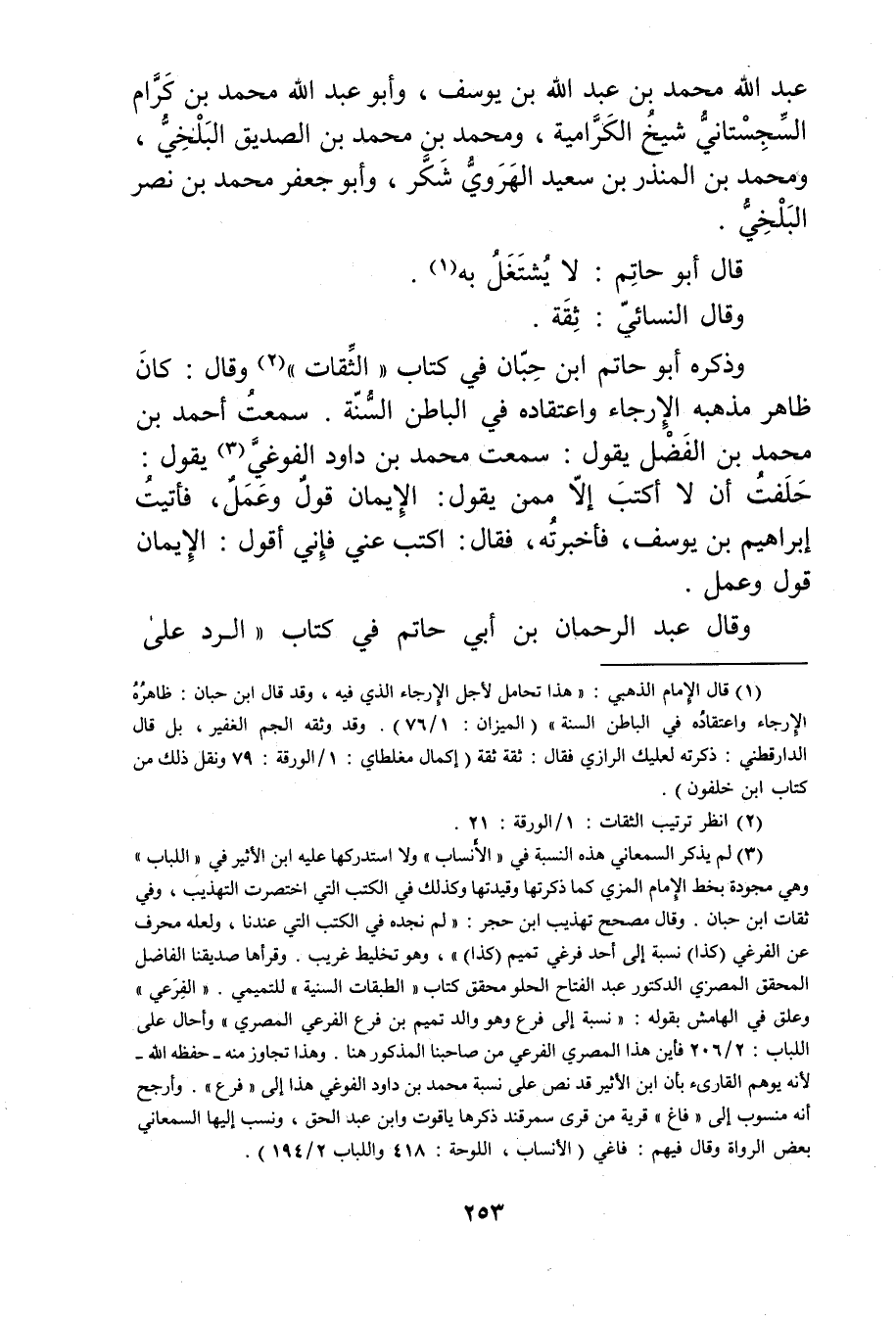 (1) قال الإمام الذهبي: هذا تحامل لاجل الارجاء الذي فيه، وقد قال ابن حبان: ظاهره الارجاء واعتقاده في الباطم السنة" (الميزان: 1 / 76) .