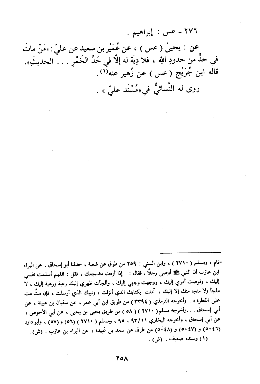 = نام، ومسلم (2710) ، وابن السني: 259 من طرق عن شعبة، حَدَّثَنَا أبو إسحاق، عن البراء ابن عازب أَنَّ النَّبِيَّ صلى الله عليه وسلم أوصى رجلا، فقال: إذا أردت مضجعك، فقل: اللهم أسلمت نفسي إليك، وفوضت أمري إليك، ووجهت وجهي إليك، وألجأت ظهري إليك رغبة ورهبة إليك، لا ملجأ ولا منجا منك إلا إليك، آمنت بكتابك الذي أنزلت، ونبيك الذي أرسلت، فأن مت مت على الفطرة". وأخرجه التِّرْمِذِيّ (3394) من طريق ابن أَبي عُمَر، عن سفيان بن عُيَيْنَة، عن أبي إسحاق..وأخرجه مسلم (2710) (58) من طريق يحيى بن يحيى، عَن أبي الأَحوص، عَن أبي إسحاق، أخرجه البخاري 11 / 93، 95، ومسلم (2710) (56) و (57) ، وأبو داود (5046) و (5047) و (5048) من طرق عن سعد بن عُبَيدة، عن البراء بن عازب. (ش) .