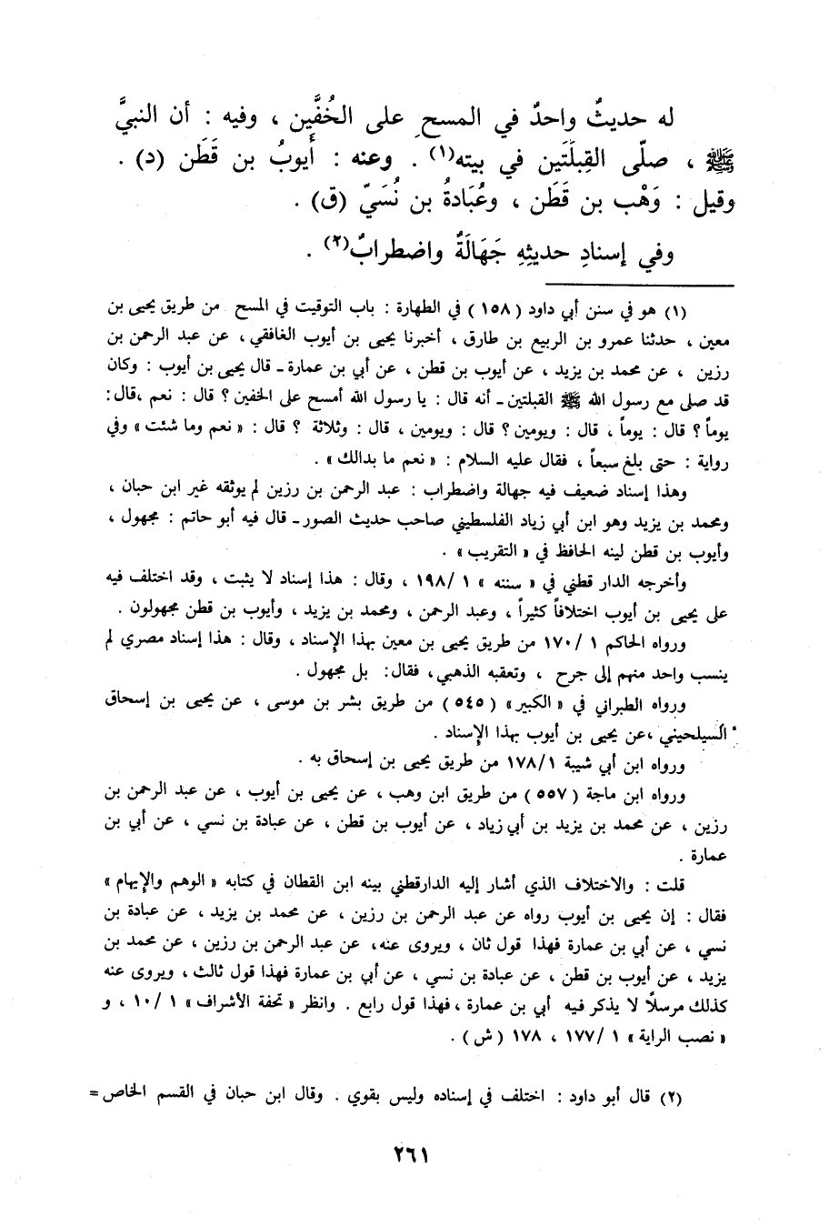 (1) هو في سنن أبي داود (158) في الطهارة: باب التوقيت في المسح من طريق يحيى بن مَعِين، حَدَّثَنَا عَمْرو بْنُ الرَّبِيعِ بْنِ طارق، أخبرنا يحيى بن أيوب الغافقي، عَنْ عَبد الرَّحْمَن بْن رزين، عن محمد بن يزيد، عن أيوب بن قطن، عَن أبي بن عمارة، قال يحيى بن أيوب: وكان قد صلى مع رسول الله صلى الله عليه وسلم القبلتين - أنه قال: يارسول الله امسح على الخفين؟ قال: نعم، قال: يوما؟ قال: يوما، قال: ويومين؟ قال: ويومين، قال: وثلاثة؟ قال: نعم وما شئت"وفي رواية: حتى بلغ سبعا، فقال عليه السلام: نعم ما بدالك.
