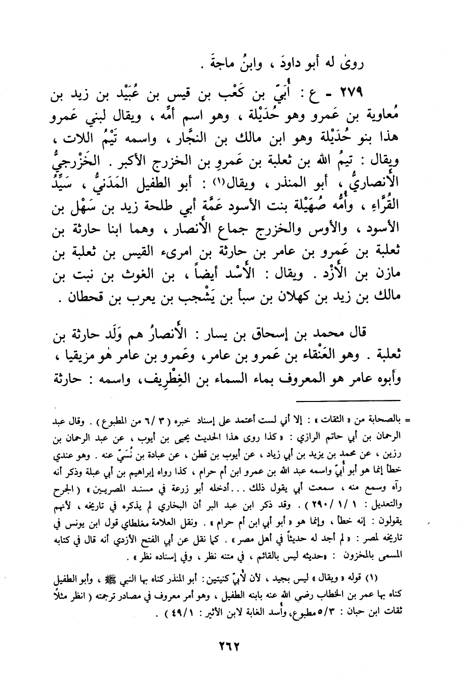 279- ع: أبي بن كعب بن قيس بن عُبَيد بن زيد بن معاوية بن عَمْرو وهو حديلة، وهو اسم أمه، ويُقال لبني عَمْرو هذا بنو حديلة وهو ابن مالك بْن النجار، واسمه تيم اللات، ويُقال: تيم الله بْن ثعلبة بْن عَمْرو بْن الخزرج الأكبر. الخزرجي الأَنْصارِيّ، أبو المنذر، ويُقال (1) : أبو الطفيل المدني، سيد القراء، وأمه صهيلة بنت الأسود عمة أبي طلحة زيد بْن سهل بْن الأسود، والأوس والخزرج جماع الأنصار، وهما ابنا حارثة بْن ثعلبة بْن عَمْرو بْن عامر بْن حارثة بْن امرئ القيس بْن ثعلبة بْن مازن بْن الأزد.