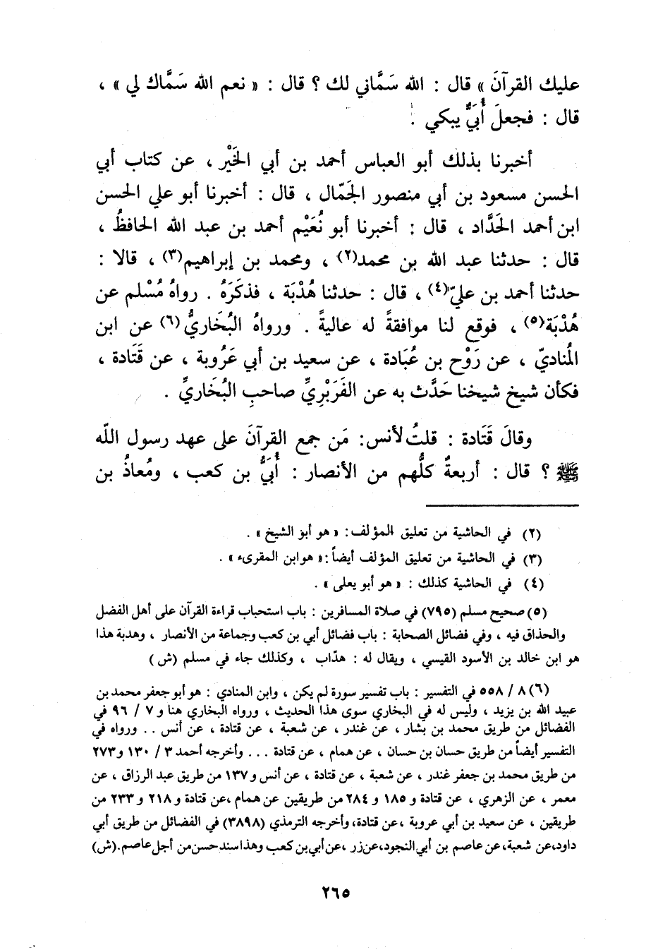 (6) 8 / 558 في التفسير: باب تفسير سورة لم يكن، وابن المنادي: هو أبو جعفر محمد بن عُبَيد الله بن يزيد، وليس له في البخاري سوى هذا الحديث، ورواه البخاري هنا و7 / 96 في الفضائل من طريق مُحَمَّدِ بْنِ بَشَّارٍ، عَنْ غُنْدَرٍ، عَنْ شُعْبَةَ، عَنْ قَتَادَةَ، عَنِ أنس..ورواه في التفسير أيضا من طريق حسان بن حسان، عن همام، عن قتادة..وأخرجه أحمد 3 / 130 و273 من طريق محمد بن جعفر غندر، عن شعبة، عن قتادة، عن أنس و137 من طريق عبد الرزاق عن معمر، عن الزُّهْرِيّ، عن قتادة و185 و284 من طريقين عن همام، عن قتادة و218 و233 من طريقين، عن سَعِيد بن أَبي عَرُوبَة، عن قتادة، وأخرجه التِّرْمِذِيّ (3898) في الفضائل من طريق أبي داود، عن شعبة، عن عاصم بن أَبي النجود، عن زر، عَن أبي بن كعب وهذا سند حسن من أجل عاصم. (ش)