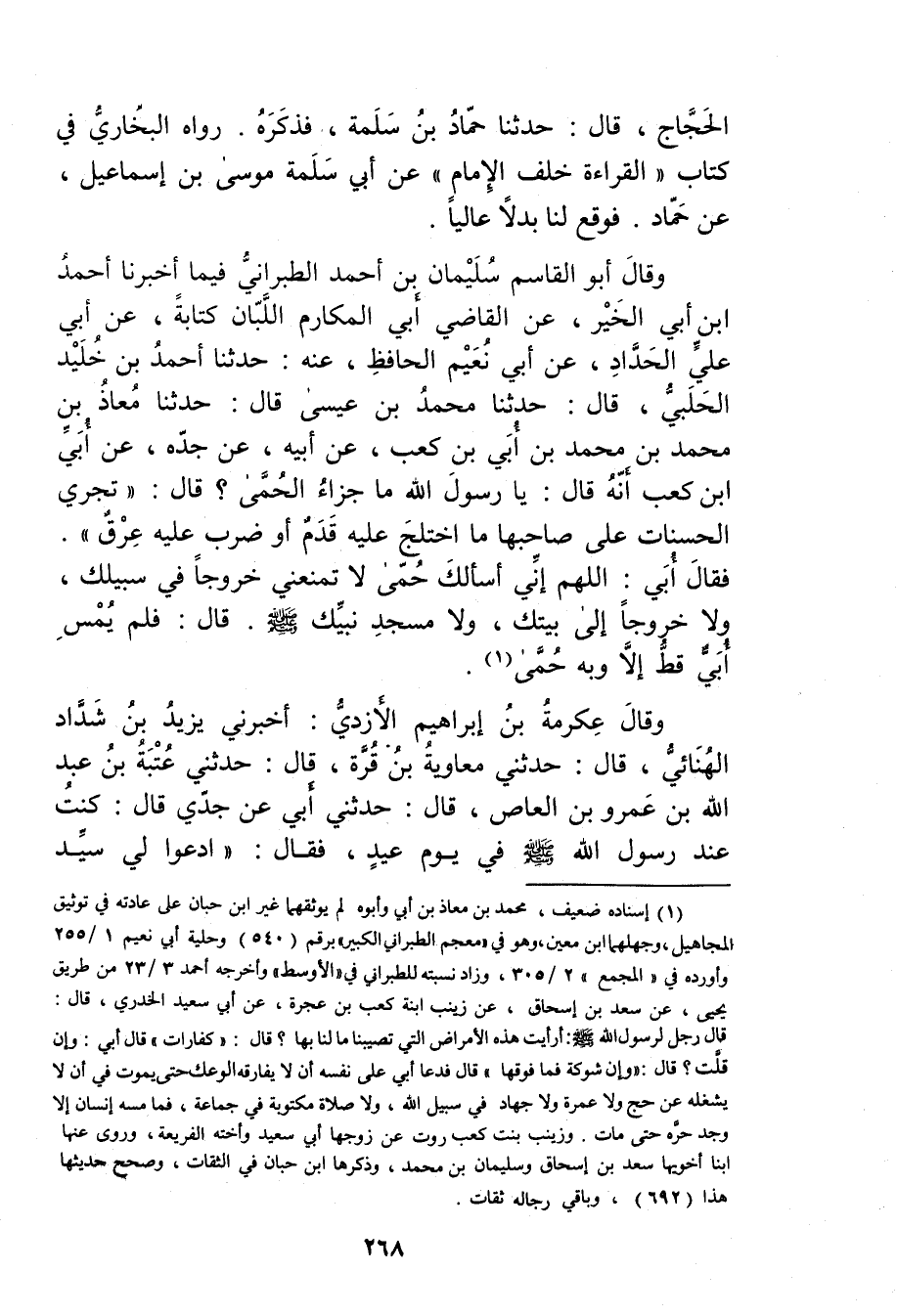 وَقَال أَبُو الْقاسِمِ سُلَيْمان بْن أَحْمَد الطبراني فيما أَخْبَرَنَا أَحْمَد بْن أَبي الخير، عَنْ القاضي أَبِي المكارم اللبان كتابة، عَن أَبِي عَلِيٍّ الْحَدَّادِ، عَن أبي نعيم الحافظ، عَن: حَدَّثَنَا أَحْمَدُ بْنُ خُلَيْدٍ الْحَلَبِيُّ، قال: حَدَّثَنَا مُحَمَّدُ بْنُ عِيسَى قال: حَدَّثَنَا مُعَاذُ بْنُ مُحَمَّدِ بْنِ مُحَمَّدِ بْنِ أَبي بْنِ كَعْبٍ، عَن أَبِيهِ، عَنْ جَدِّهِ، عَن أبي ابن كعب أنه قال: يارسول اللَّهِ مَا جَزَاءُ الْحُمَّى؟ قال: تُجْرِي الْحَسَنَاتِ عَلَى صَاحِبِهَا مَا اخْتَلَجَ عَلَيْهِ قَدَمٌ أَوْ ضَرَبَ عَلَيْهِ عِرْقٌ". فَقَالَ أُبَيٌّ: اللَّهُمَّ إِنِّي أَسْأَلُكَ حُمَّى لا تَمْنَعُنِي خُرُوجًا فِي سَبِيلِكَ، ولا خُرُوجًا إلى بيتك، ولا سجد نَبِيِّكَ صَلَّى اللَّهُ عَلَيْهُ وسَلَّمَ. قال: فَلَمْ يُمَسَّ أُبَيٌّ قَطُّ إِلا وبِهِ حُمَّى (1) .