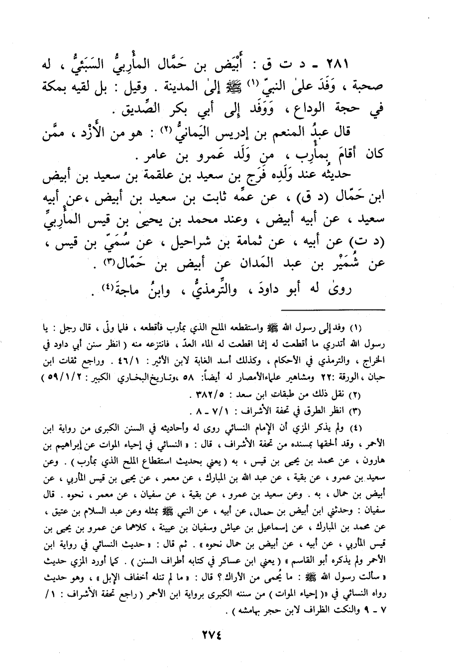 281- د ت ق: أبيض بن حمال المأربي السبئي، لهُ صُحبَةٌ، وفد على النَّبِيّ (1) صَلَّى اللَّهُ عليه وسلم إلى المدينة.