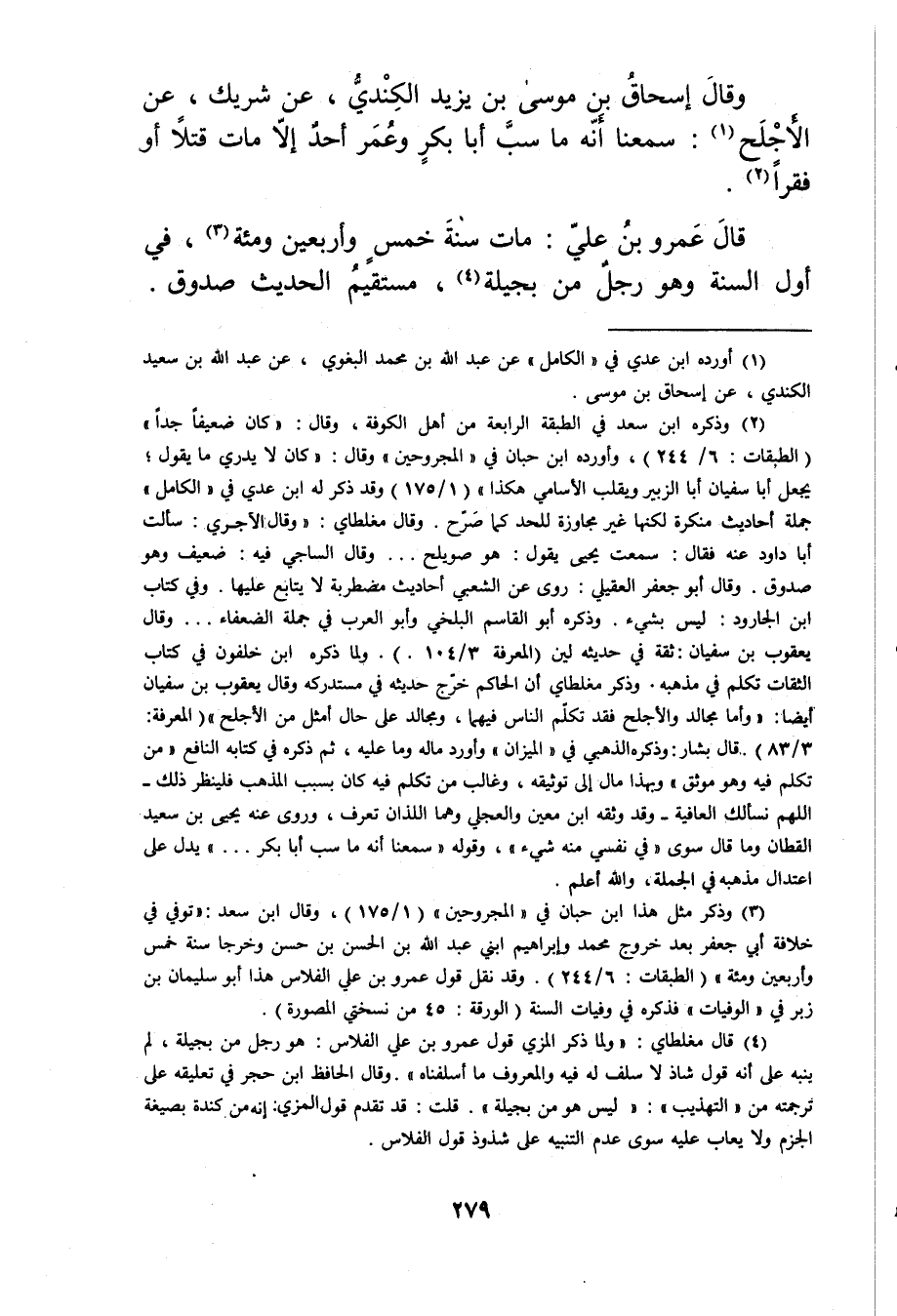 (4) قال مغلطاي: ولما ذكر المزي قول عَمْرو بن علي الفلاس: هو رجل من بجيلة، لم ينبه على أنه قول شاذ لا سلف له فيه والمعروف ما أسلفناه".وَقَال الحافظ ابن حجر في تعليقه على ترجمته من"التهذيب": ليس هو من بجيلة". قلت: قد تقدم قول المزي: إنه من كندة بصيغة الجزم ولا يعاب عليه سوى عدم التنبيه على شذوذ قول الفلاس.