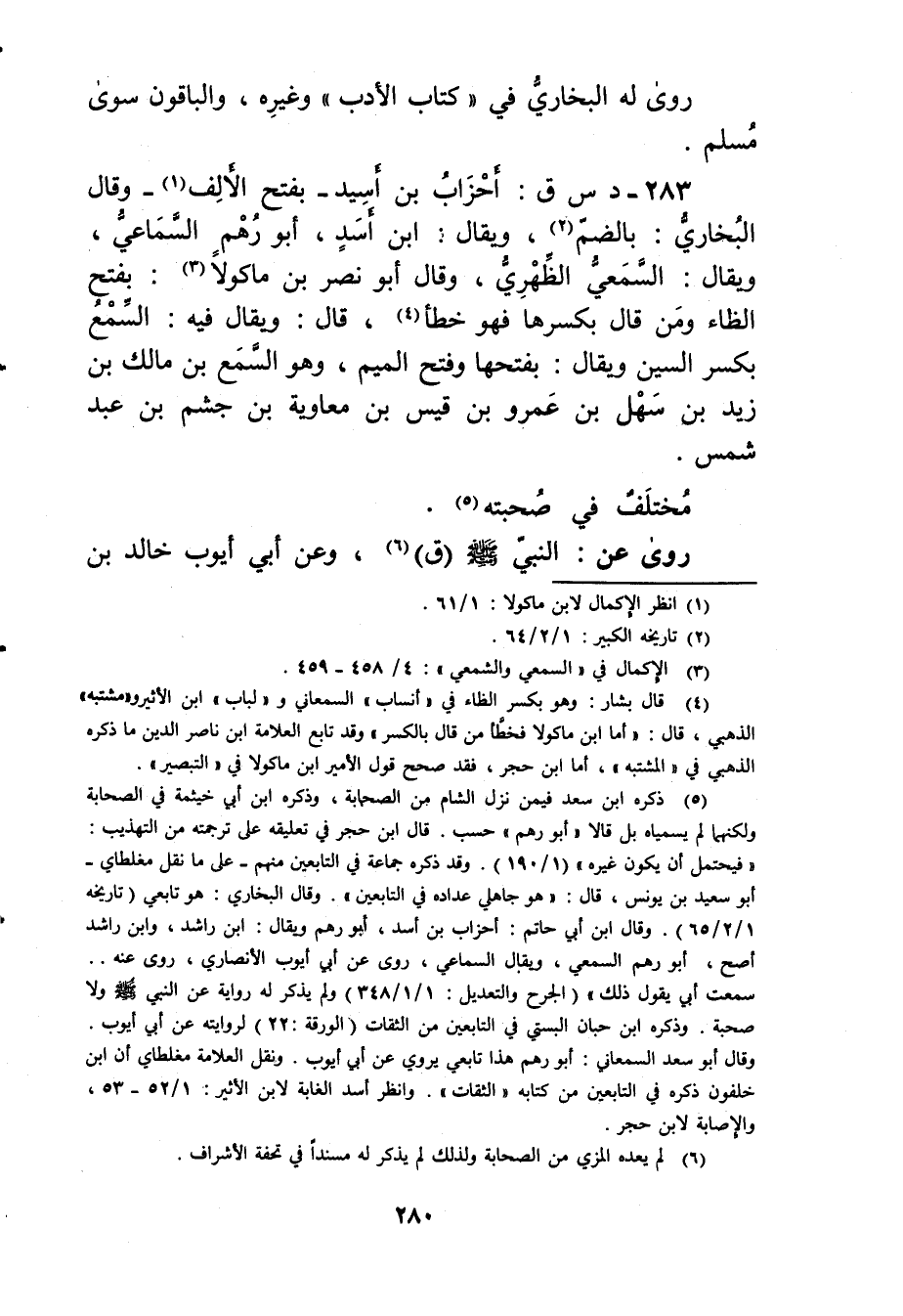 283- د س ق: أحزاب بن أسيد - بفتح الألف (1) - وقَال البُخارِيُّ: بالضم (2) ، ويُقال: ابن أسد، أبورهم السماعي، ويُقال: السمعي الظهري، وَقَال أبو نصر بْن ماكولا (3) : بفتح الظاء ومن قال بكسرها فهو خطأ (4) ، قال: ويُقال فيه: السمع بكسر السين ويُقال: بفتحها وفتح الميم، وهو السمع بْن مالك بْن زيد بْن سهل بْن عَمْرو بْن قيس بْن معاوية بْن جشم بْن عَبْد شمس.