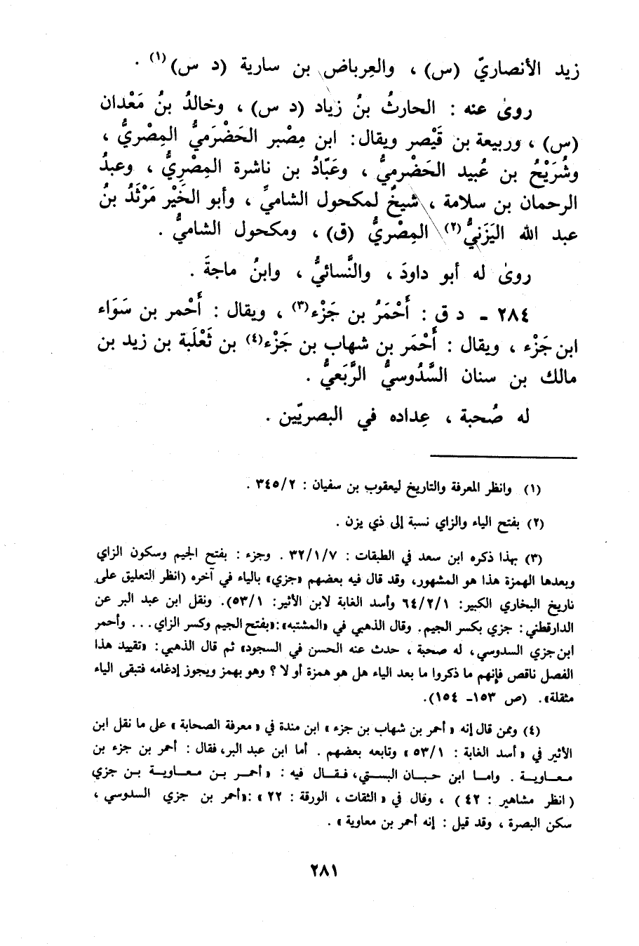 (3) بهذا ذكره ابن سعد في الطبقات: 7 / 1 / 32. وجزء: بفتح الجيم وسكون الزاي وبعدها الهمزة هذا هو المشهور، وقد قال فيه بعضهم"جزي"بالياء في آخره (انظر التعليق على تاريخ البخاري الكبير: 1 / 2 / 64 وأسد الغابة لابن الاثير: 1 / 53) . ونقل ابن عَبد الْبَرِّ عن الدارقطني: جزي بكسر الجيم. وَقَال الذهبي في "المشتبه": بفتح الجيم وكسر الزاي..وأحمر ابن جزي السدوسي، لهُ صُحبَةٌ، حدث عنه الحسن في السجود"ثم قال الذهبي: تقييد هذا الفصل ناقص فإنهم ما ذكروا ما بعد الياء هل هو همزة أو لا؟ وهو بهمز ويجوز إدغامه فتبقى الياء مثقلة.