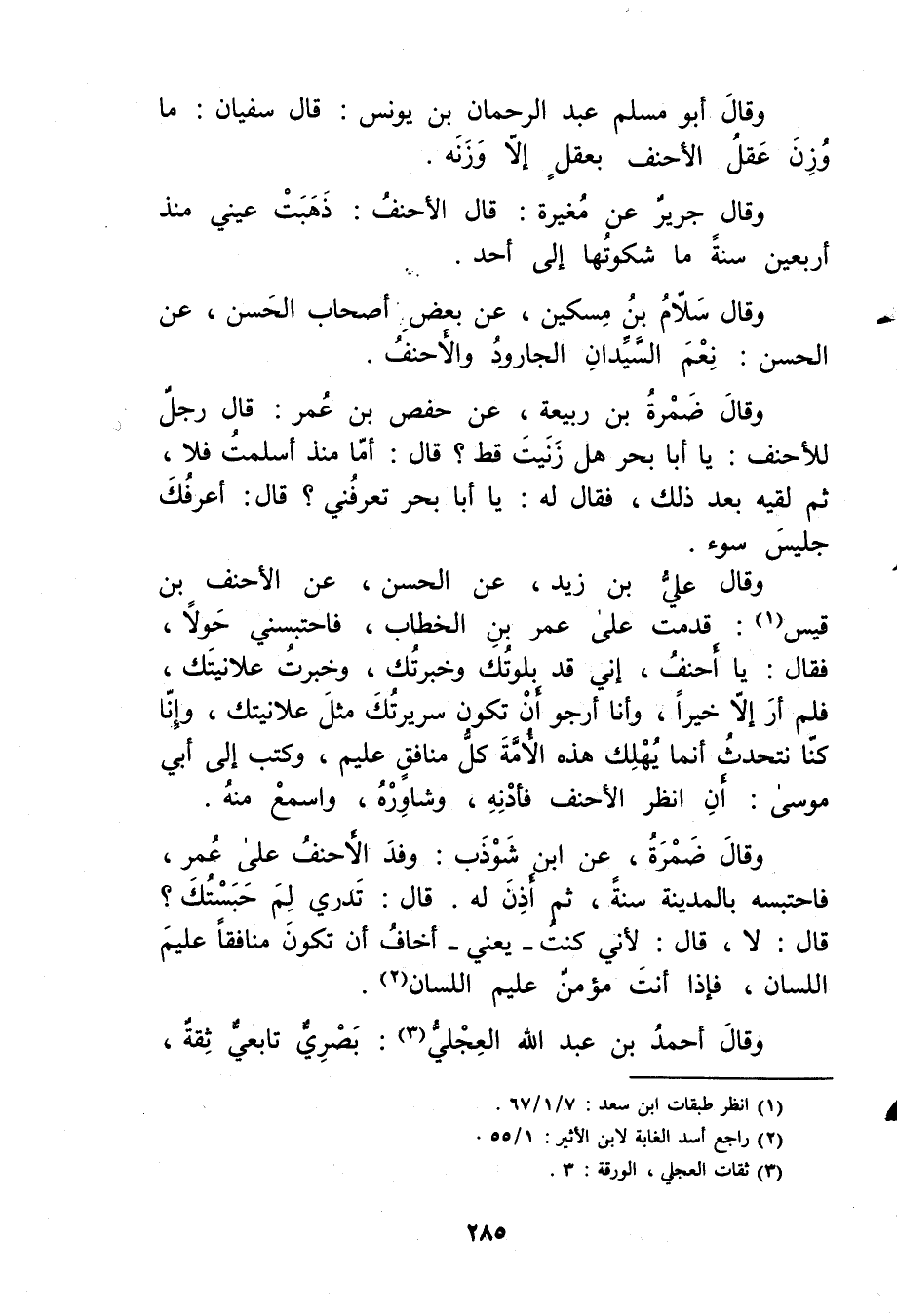 وَقَال ضمرة بْن ربيعة، عَن حفص بْن عُمَر: قال رجل للأحنف: يا أبا بحر هل زنيت قط؟ قال: أما منذ أسلمت فلا، ثم لقيه بعد ذلك، فَقَالَ له: يا أبا بحر تعرفني؟ قال: أعرفك جليس سوء.