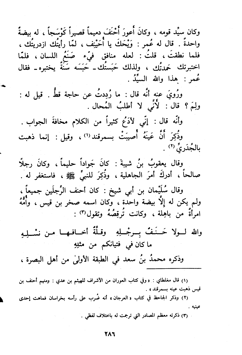 (1) قال مغلطاي: وفي كتاب العوران من الاشراف للهيثم بن عدي: ومنهم أحنف بن قيس ذهبت عينه بسمرقند.