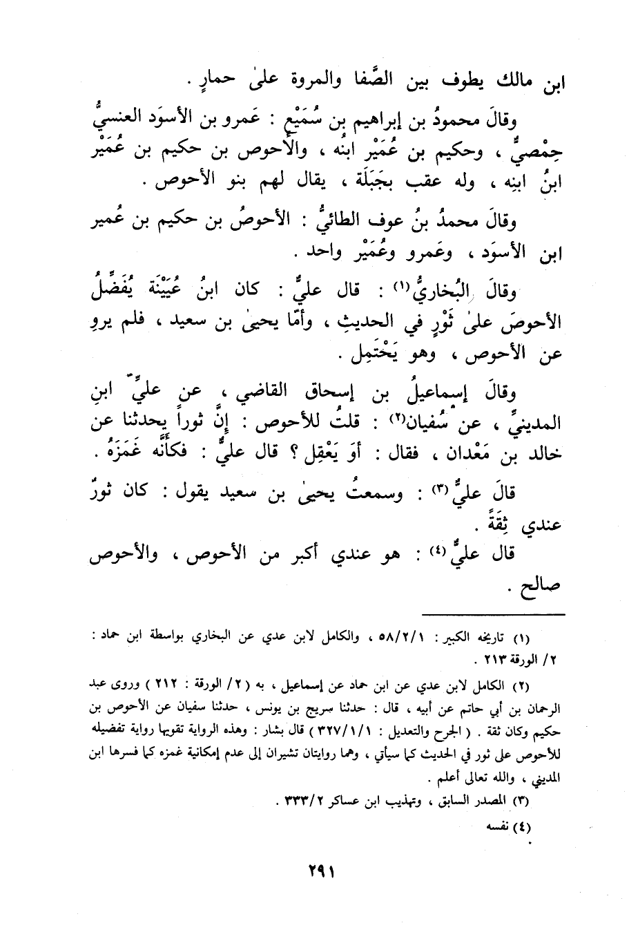 (2) الكامل لابن عدي عن ابن حماد عن إسماعيل، به (2 / الورقة: 212) وروى عَبْد الرَّحْمَنِ بْن أَبي حَاتِم عَن أبيه، قال: حَدَّثَنَا سُرَيْجُ بْنُ يُونُسَ، حَدَّثَنَا سفيان عن الأَحوص بن حكيم وكان ثقة. (الجرح والتعديل: 1 / 1 / 327) قال بشار: وهذه الرواية تقويها رواية تفضيله للاحوص على ثور في الحديث كما سيأتي، وهما روايتان تشيران إلى عدم إمكانية غمزه كما فسرها ابن المديني، والله تعالى أعلم.