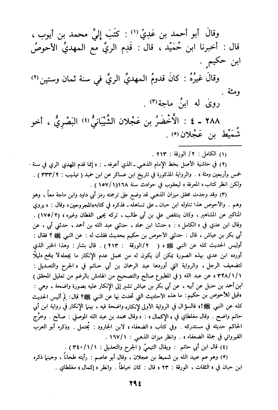 (3) وقد وجدت محقق ميزان الذهبي قد وضع على ترجمته رمز أبي داود وابن ماجة معا، وهو وهم. والأَحوص هذا تناوله ابن حبان - على تساهله - فذكره في كتابه"المجروحين"وَقَال: يروي المناكير عن المشاهير، وكان ينتقص علي بن أَبي طالب، تركه يحيى القطان وغيره" (2/175) . وَقَال ابن عدي في "الكامل": حَدَّثَنَا ابن حماد، حدثني عَبد الله بن أحمد، حَدَّثني أبي، عَن أبي بكر بن عياش، قال: حدثني الأَحوص بن حكيم بحديث فقلت له: عن النبي صلى الله عليه وسلم؟ فقال: أو ليس الحديث كله عن النبي صلى الله عليه وسلم" (2 / الورقة: 213) . قال بشار: وهذا الخبر الذي أورده ابن عدي بهذه الصورة يمكن أن يكون له من محمل عدم الانكار كا يجعله لا ينفع دليلا لتضعيف الرجل، والرواية التي أوردها عبد الرحمن بن أَبي حاتم في "الجرح والتعديل: 1 / 1 / 328"عن عَبد الله (في المطبوع صالح والتصحيح من الهامش بالرغم من تعليل المحقق) ابن أحمد بن حنبل عَن أبيه، عَن أبي بكر بن عياش تشير إلى الانكار عليه بصورة واضحة، وهي: قيل للاحوص بن حكيم: ما هذه الاحاديث التي تحدث بها عن النبي صلى الله عليه وسلم؟ قال: لم أليس الحديث كله عن النبي صلى الله عليه وسلم! "فالسؤال في الرواية الاولى لانكاره واضحة فيه، بينما الانكار في رواية ابن أَبي حاتم واضح. وَقَال مغلطاي في "الاكمال": وَقَال محمد بن عَبد الله الموصلي: صالح. وخرج الحاكم حديثه في مستدركه. وفي كتاب"الضعفاء"لابن الجارود: يحتمل. وذكره أبو العرب القيرواني في جملة الضعفاء". وانظر ميزان الذهبي: 1 / 167.