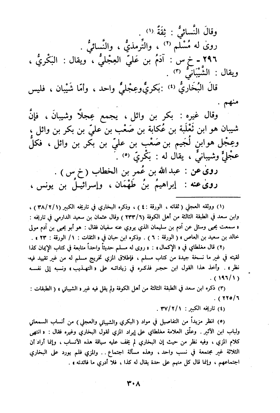 (5) انظر مزيدا من التفاصيل في مواد (البكري والشيباني والعجلي) من أنساب السمعاني ولباب ابن الاثير. وعلق العلامة مغلطاي على إيراد المزي لقول البخاري وغيره فقال: انتهى كلام المزي، وفيه نظر من حيث إن البخاري لم يخف عليه سياقة هذه الانساب، وإنما أراد أن الثلاثة غير مجتمعة في نسب واحد، وهذه مسألة اجتماع. والمزي فلم يورد على البخاري اجتماعهم، وإنما قال كل منهم على حدة يقال له كذا، فلا أدري ما فائدته".
