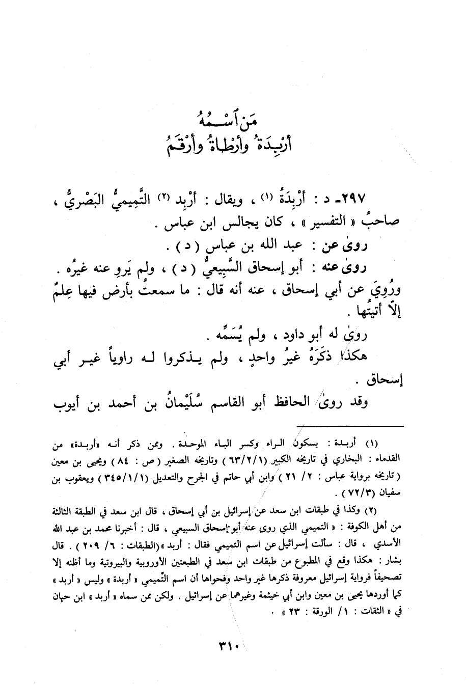 (2) وكذا في طبقات ابن سعد عن إسرائيل بن أَبي إسحاق، قال ابن سعد في الطبقة الثالثة من أهل الكوفة: التميمي الَّذِي روى عنه أَبُو إِسْحَاقَ السبيعي، قال: أخبرنا محمد بن عَبد الله الأسدي، قال: سألت إسرائيل عن اسم التميمي فقال: أربد" (الطبقات: 6 / 209) . قال بشار: هكذا وقع في المطبوع من طبقات ابن سعد في الطبعتين الاوروبية والبيروتية وما أظنه إلا تصحيفا فرواية إسرائيل معروفة ذكرها غير واحد وفحوها أن اسم التميمي"أربدة"وليس"أربد"كما أوردها يحيى بن مَعِين وابن أَبي خيثمة وغيرهما عن إسرائيل. ولكن ممن سماه"أربد"ابن حبان في "الثقات: 1 / الورقة: 23".