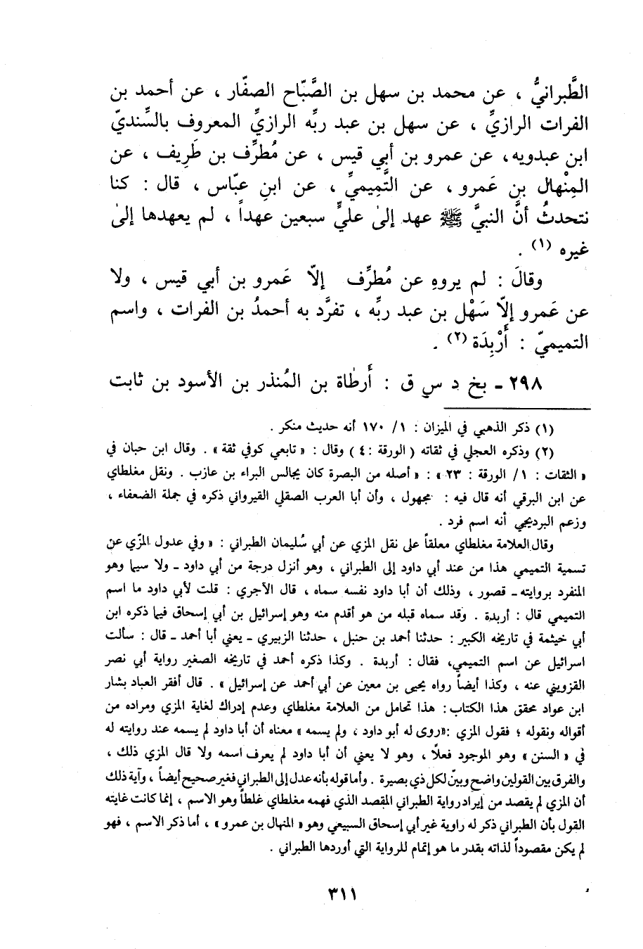 الطَّبَرَانِيُّ، عَنْ مُحَمَّدِ بْنِ سَهْلِ بْنِ الصَّبَّاحِ الصَّفَّارِ، عَنْ أَحْمَدَ بْنِ الْفُرَاتِ الرَّازِيِّ، عَنْ سَهْلِ بْنِ عَبْدِ رَبِّهِ الرَّازِيِّ الْمَعْرُوفِ بالسندي ابن عَبْدَوَيْهِ، عَنْ عَمْرو بْنِ أَبي قَيْسٍ، عَنْ مُطَرِّفِ بْنِ طَرِيفٍ، عَنِ الْمِنْهَالِ بْنِ عَمْرو، عَنِ التميمي، عن ابن عباس، عَنِ الْمِنْهَالِ بْنِ عَمْرو، عَنِ التَّمِيمِيِّ، عَنِ ابْنِ عَبَّاسٍ، قال: كُنَّا نَتَحَدَّثُ أَنَّ النَّبِيَّ صَلَّى اللَّهُ عَلَيْهِ وسَلَّمَ عَهِدَ إِلَى عَلِيٍّ سَبْعِينَ عَهْدًا، لَمْ يَعْهَدْهَا إِلَى غيْرِهِ (1) .