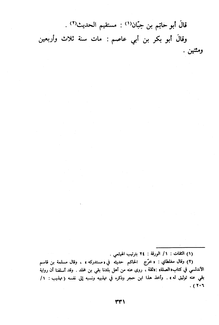 (2) وَقَال مغلطاي: خرج الحاكم حديثه في "مستدركه"، وَقَال مسلمة بن قاسم الاندلسي في كتاب"الصلة: ثقة، روى عنه من أهل بلدنا بقي بن مخلد. وقد أسلفنا أن رواية بقي عنه توثيق له". وأخذ هذا ابن حجر وذكره في تهذيبه ونسبه إلى نفسه (تهذيب: 1 / 206) .