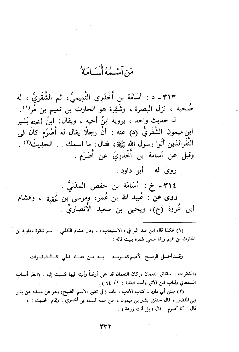 313 - د: أسامة بن أخدري التميمي، ثم الشقري، لهُ صُحبَةٌ، نزل البصرة، وشقرة هو الحارث بْن تميم بْن مر (1) .