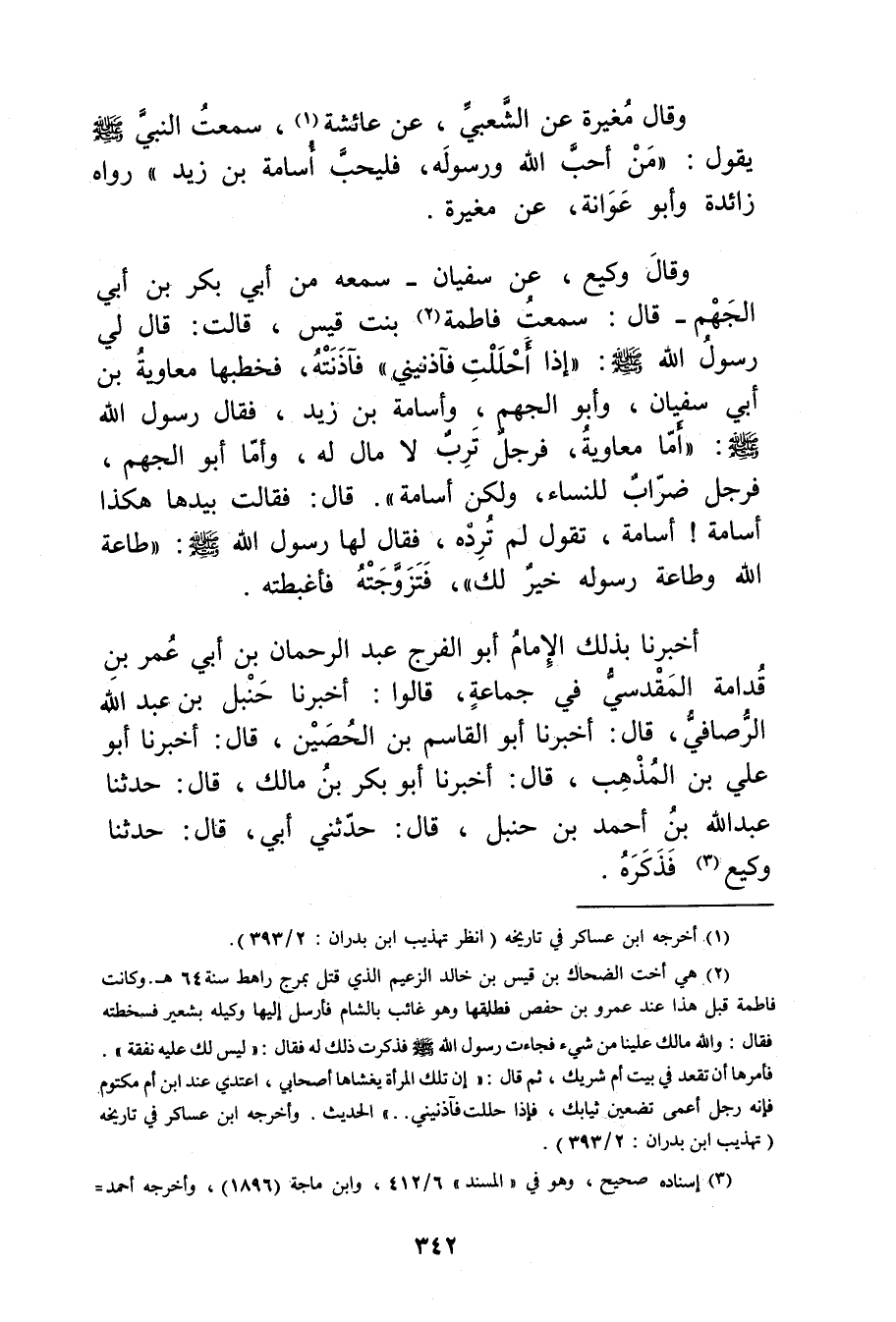 أَخْبَرَنَا بذلك الإمام أبو الفرج عَبْدُ الرَّحْمَنِ بْنُ أَبي عُمَر بْن قدامة المقدسي فِي جماعة، قالوا: أَخْبَرَنَا حنبل بْن عَبد الله الرصافي، قال: أَخْبَرَنَا أبو القاسم بْن الحصين، قال: أَخْبَرَنَا أبو علي بْن المذهب، قال: أَخْبَرَنَا أبو بكر بْن مالك، قال: حَدَّثَنَا عَبد اللَّهِ بْن أحمد بْن حنبل، قال: حَدَّثني أبي، قال: حَدَّثَنَا وكيع (3) فذكره.