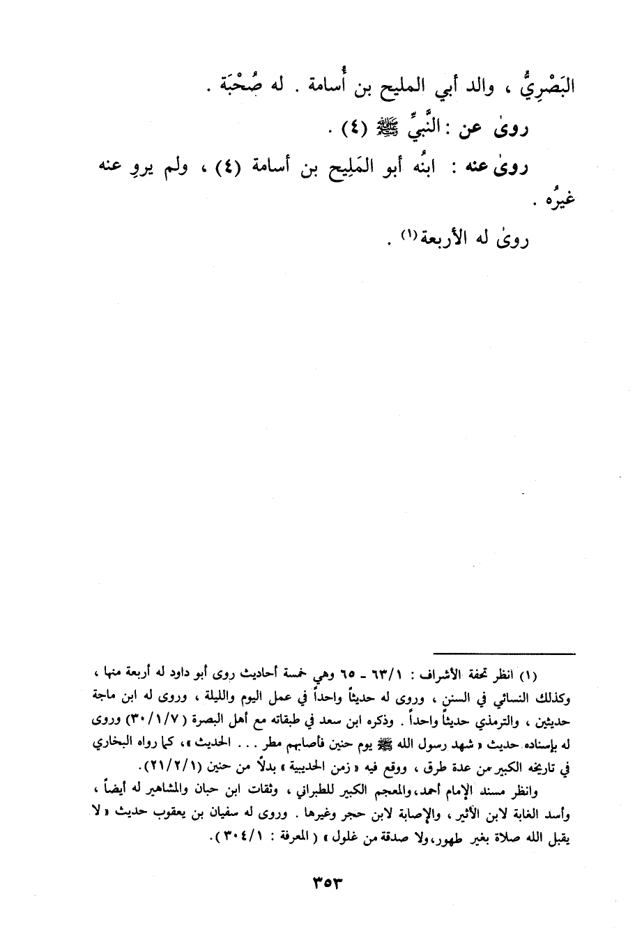 (1) انظر تحفة الاشراف: 1 / 63 - 65 وهي خمسة أحاديث روى أبو داود له أربعة منها، وكذلك النَّسَائي في السنن، وروى له حديثًا واحدًا في عمل اليوم والليلة، وروى له ابن ماجة حديثين، والتِّرْمِذِيّ حديثًا واحدًا. وذكره ابن سعد في طبقاته مع أهل البصرة (7 / 1 / 30) وروى له بإسناده حديث: "شهد رسول الله صلى الله عليه وسلم يوم حنين فأصابهم مطر..الحديث"، كما رواه البخاري في تاريخه الكبير من عدة طرق، ووقع فيه"زمن الحديبية"بدلا من حنين (1 / 2 / 21) .
