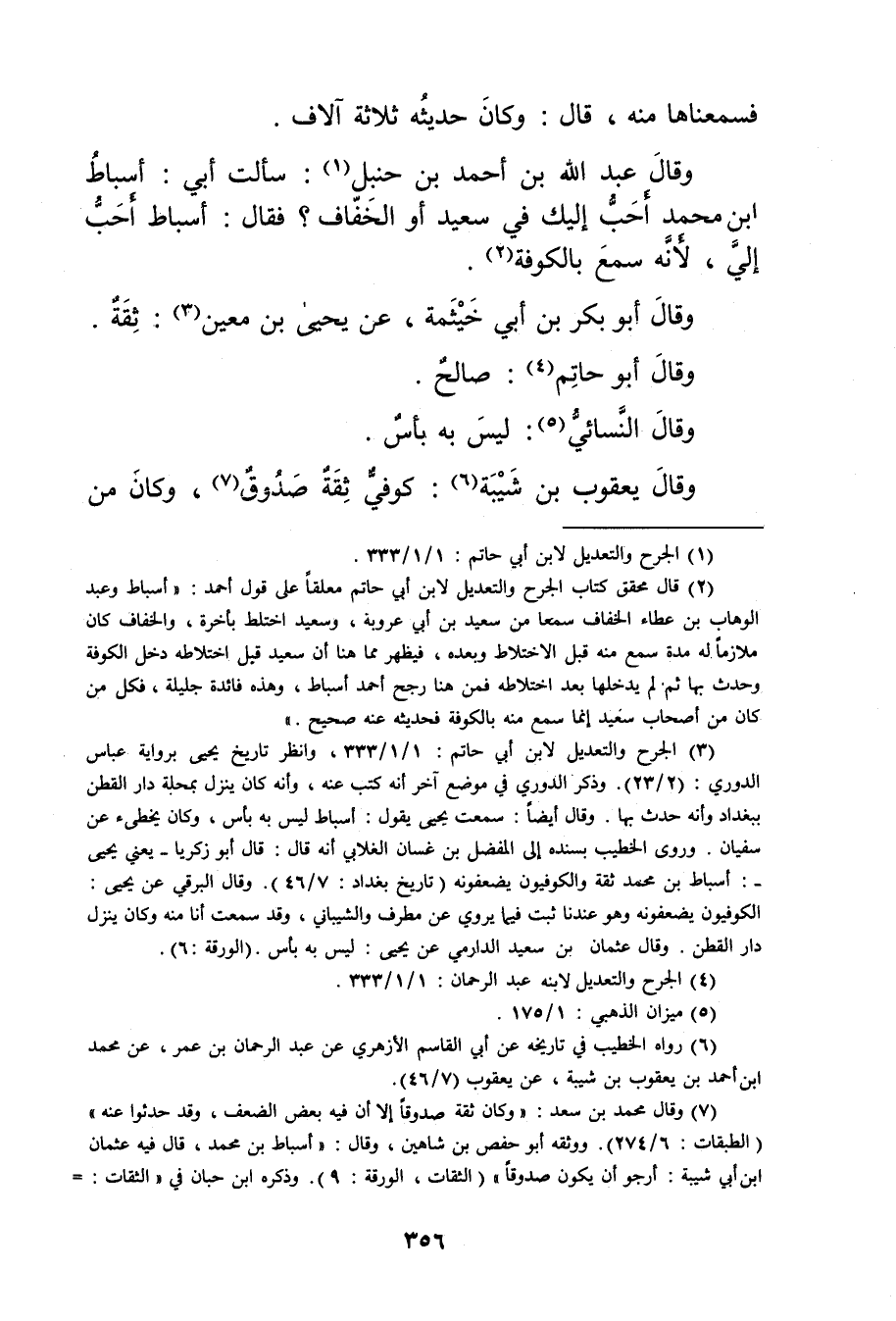 (2) قال محقق كتاب الجرح والتعديل لابن أَبي حاتم معلقا على قول أحمد: أسباط وعبد الوهاب بْن عَطَاء الخفاف سمعا من سَعِيد بْن أَبي عَرُوبَة، وسَعِيد اختلط بأخرة، والخفاف كان ملازما له مدة سمع منه قبل الاختلاط وبعده، فيظهر مما هنا أن سَعِيد قبل اختلاطه دخل الكوفة وحدث بها ثم لم يدخلها بعد اختلاطه فمن هنا رجح أحمد أسباط، وهذه فائدة جليلة، فكل من كان من أصحاب سَعِيد إنما سمع منه بالكوفة فحديثه عنه صحيح."
