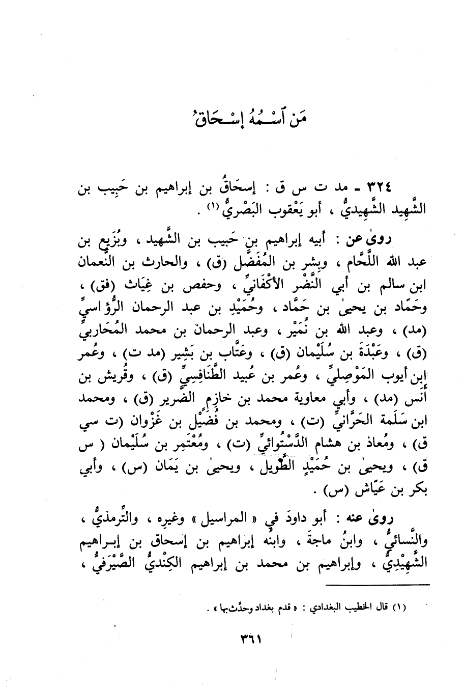 324 - مد ت س ق: إسحاق بن إِبْرَاهِيم بن حبيب بن الشهيد الشهيدي، أبو يعقوب البَصْرِيّ (1) .