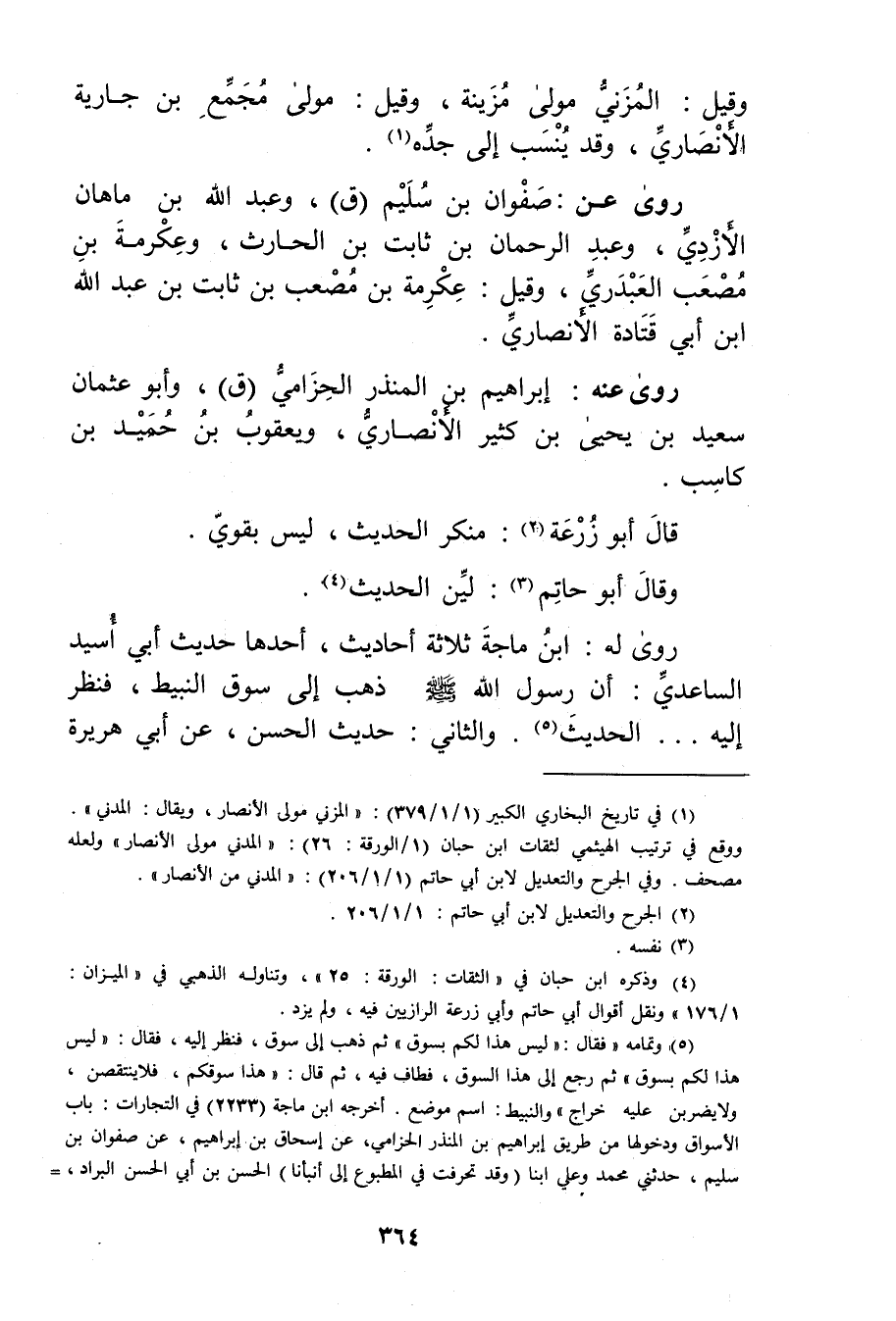 (1) في تاريخ البخاري الكبير (1 / 1 / 379) : المزني مولى الانصار، ويُقال: المدني". ووقع في ترتيب الهيثمي لثقات ابن حبان (1 / الورقة: 26) : المدني مولى الانصار"ولعله مصحف. وفي الجرح والتعديل لابن أَبي حاتم (1 / 1 / 206) : المدني من الانصار.