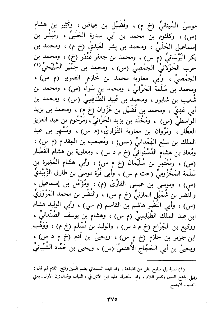 (1) نسبة إلى سليح بطن من قضاعة، وقد قيده السمعاني بضم السين وفتح اللام ثم قال: وقيل: بفتح السين وكسر اللام، وقد استدرك عليه ابن الاثير في "اللباب"وَقَال: إن الاول، يعني الضم - لا يصح.