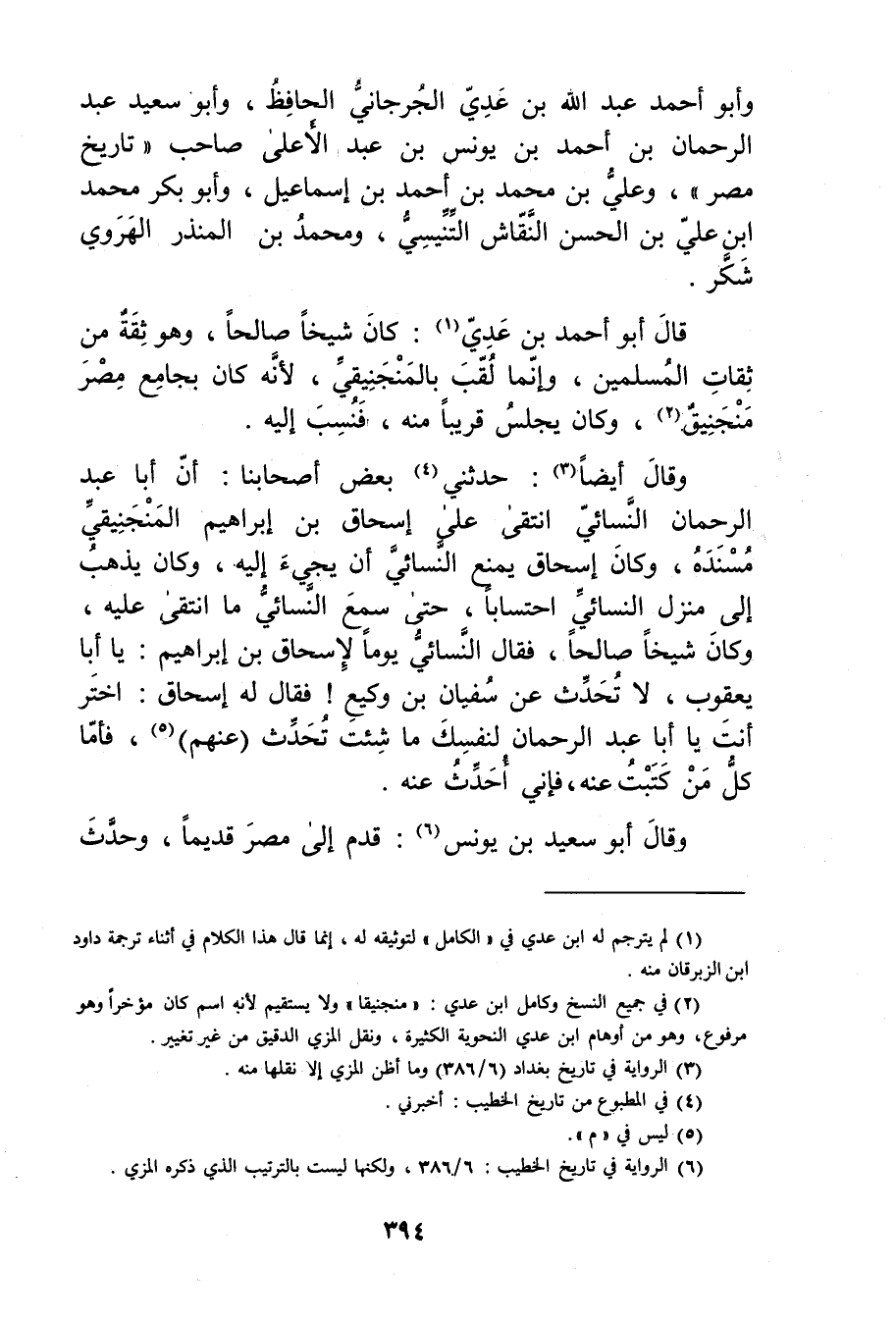 قال أَبُو أَحْمَد بْن عَدِيّ (1) : كان شيخا صالحا، وهو ثقة من ثقات المسلمين، وإنما لقب بالمنجنيقي، لأنه كان بجامع مصر منجنيق (2) ، وكان يجلس قريبا منه، فنسب إليه.
