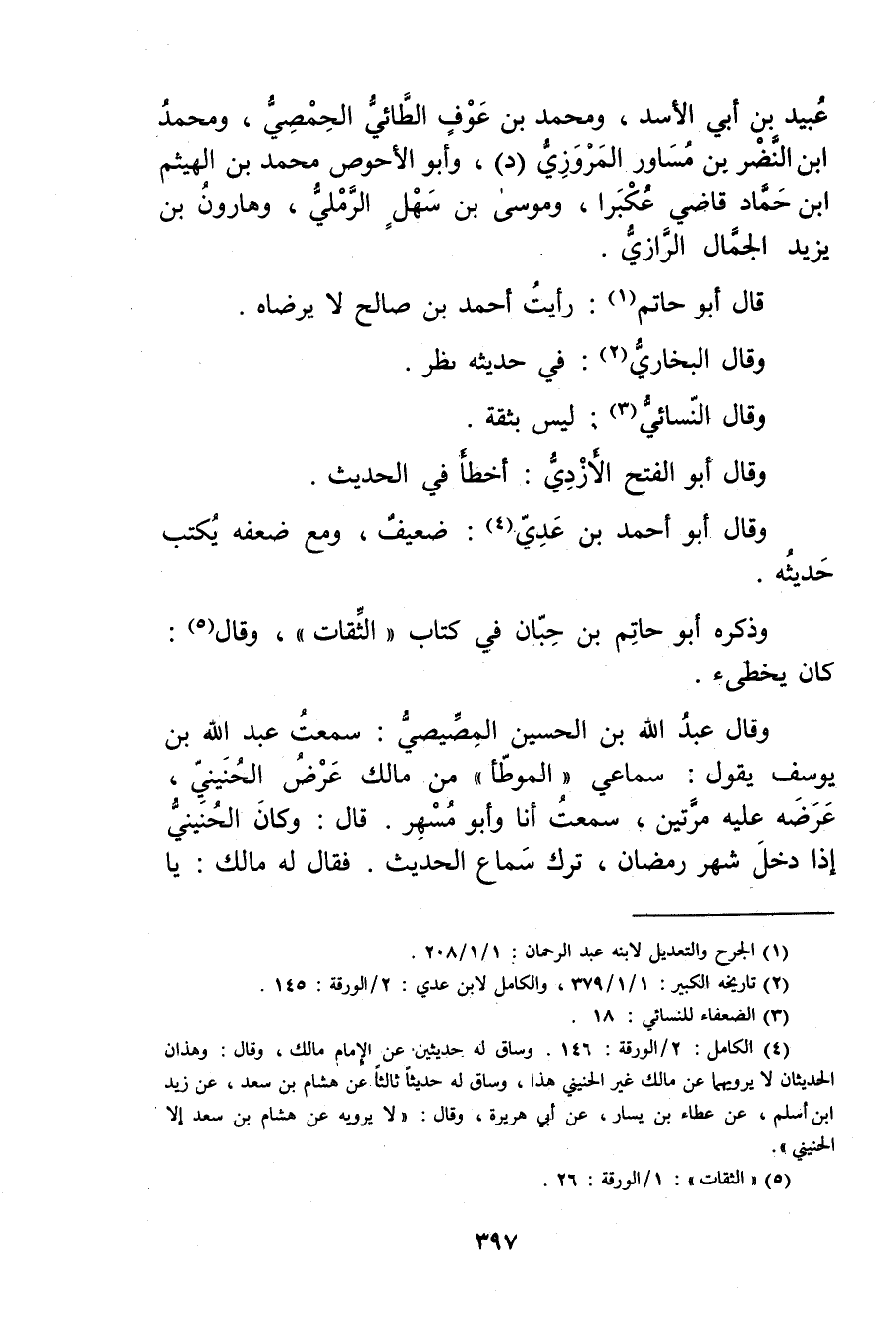(4) الكامل: 2 / الورقة: 146. وساق له حديثين عن الإمام مالك، وَقَال: وهذان الحديثًان لا يرويهما عن مالك غير الحنيني هذا، وساق له حديثًا ثالثا عَنْ هِشَامِ بْنِ سَعْدٍ، عَنْ زيد ابن أسلم، عَنْ عطاء بْن يسار، عَن أبي هُرَيْرة، وَقَال: لا يرويه عن هشام بن سعد إلا الحنيني.