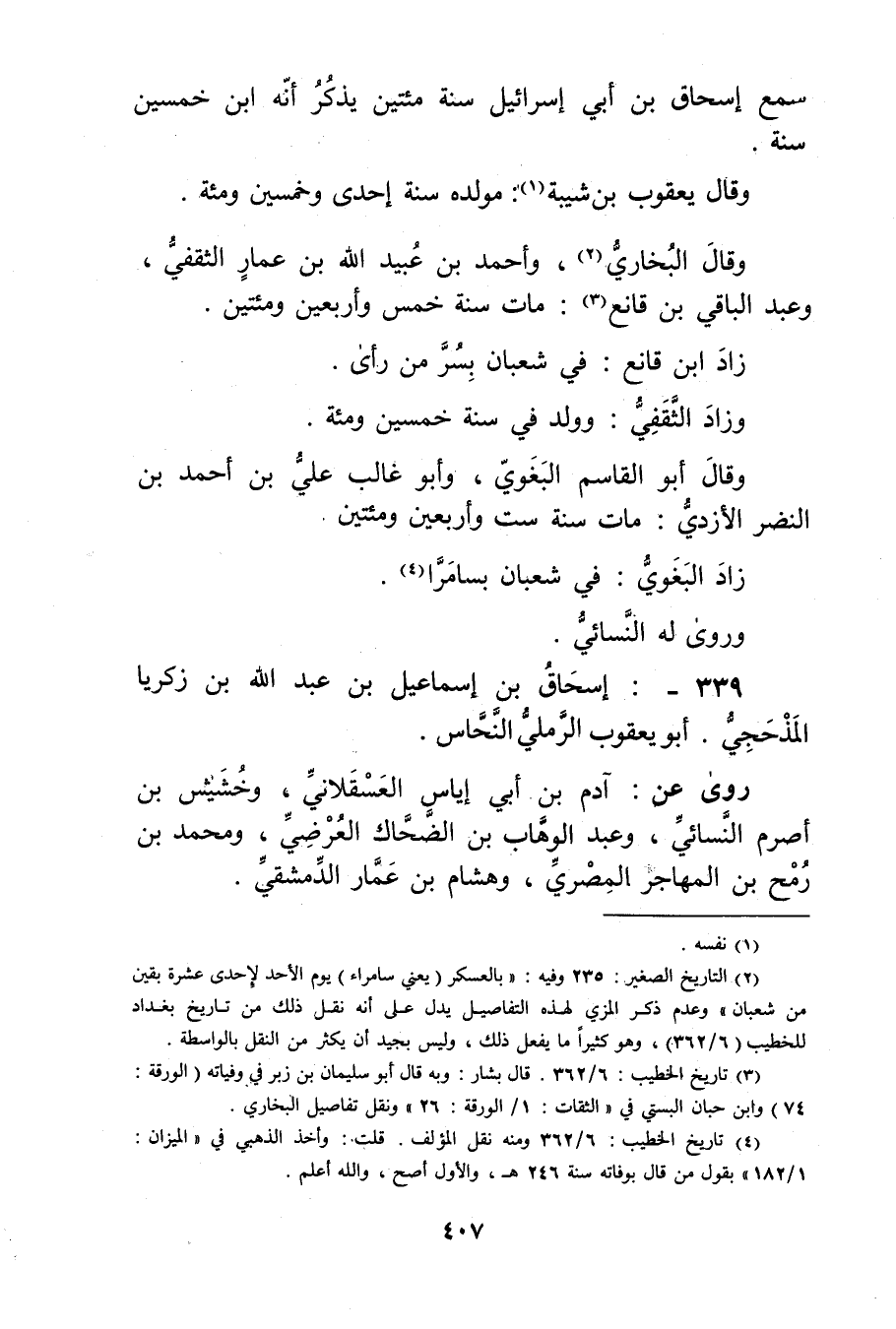 (3) تاريخ الخطيب: 6 / 362. قال بشار: وبه قال أَبُو سُلَيْمان بْن زبر في وفياته (الورقة: 74) وابن حبان البستي في "الثقات: 1 / الورقة: 26"ونقل تفاصيل البخاري.
