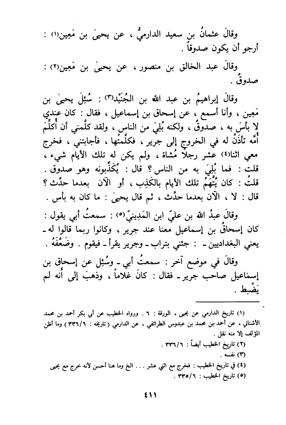 (1) تاريخ الدارمي عن يحيى، الورقة: 6. ورواه الخطيب عَن أَبِي بَكْر أَحْمَد بْن محمد الاشناني، عن أَحْمَد بْن مُحَمَّد بْن عبدوس الطرائفي، عن الدارمي (تاريخه: 6 / 336) وما أظن المؤلف إلا منه نقل.