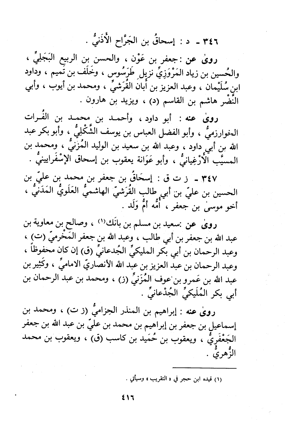 347 - ز ت ق: إسحاق بن جعفر بن مُحَمَّد بن علي بْن الحسين بْن علي بْن أَبي طالب القرشي الهاشمي العلوي المدني، أخو موسى بْن جعفر، أمه أم ولد.