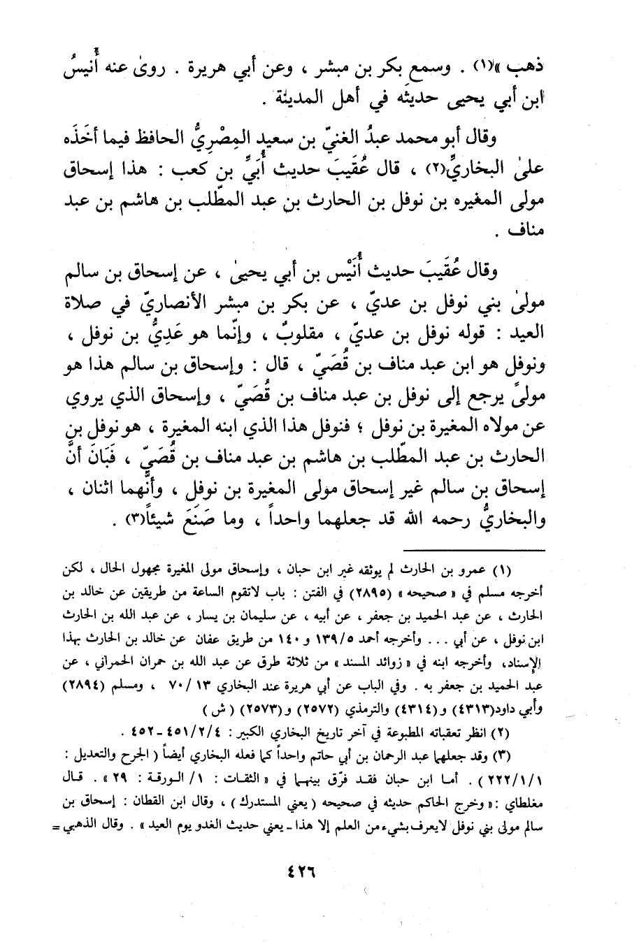 وَقَال عقيب حديث أنيس بْن أَبي يحيى، عَن إسحاق بْن سالم مولى بني نوفل بْن عدي، عَن بكر بْن مبشر الأَنْصارِيّ في صلاة العيد: قوله نوفل بْن عدي، مقلوب، وإنما هو عدي بْن نوفل، ونوفل هو ابن عَبْد مناف بْن قصي، قال: وإسحاق بْن سالم هذا هو مولى يرجع إلى نوفل بْن عَبْد مناف بْن قصي، وإسحاق الذي يروي عَن مولاه المغيرة بْن نوفل، فنوفل هذا الذي ابنه المغيرة، هو نوفل بن الحارث بن عبد المطلب بْن هاشم بْن عَبْد مناف بْن قصي، فبان أن إسحاق بْن سالم غير إسحاق مولى المغيرة بْن نوفل، وأنهما اثنان، والبخاري رحمه الله قد جعلهما واحدا، وما صنع شيئا (3) .