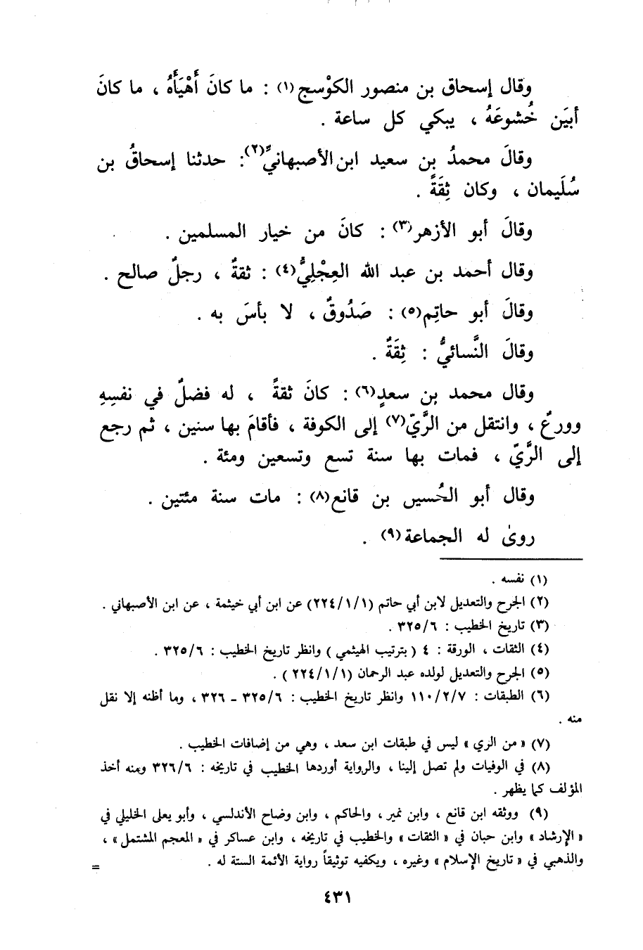 (6) الطبقات: 7 / 2 / 110 وانظر تاريخ الخطيب: 6 / 325 - 326، وما أظنه إلا نقل منه.