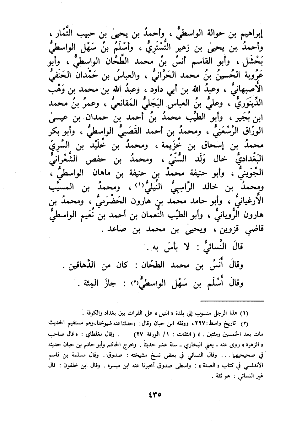 (2) تاريخ واسط: 227، ووثقه ابن حبان وَقَال: حَدَّثَنَا عنه شيوخنا، وهو مستقيم الحديث مات بعد الخمسين ومئتين. " (الثقات: 1 / الورقة: 27) . وَقَال مغلطاي: قال صاحب"الزهرة"روى عنه، يعني البخاري - سنة عشر حديثًا. وخرج الحاكم وأبو حاتم بن حبان حديثه في صحيحيهما.. وَقَال النَّسَائي في بعض نسخ مشيخته: صدوق. وَقَال مسلمة بن قاسم الاندلسي في كتاب"الصلة": واسطي صدوق أخبرنا عنه ابن ميسرة. وَقَال ابن خلفون: قال غير النَّسَائي: هو ثقة.