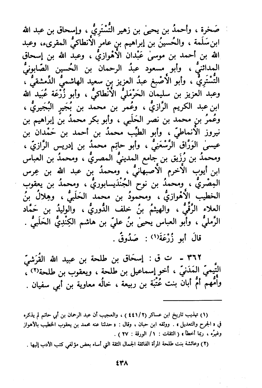 362 - ت ق: إسحاق بْن طلحة بْن عُبَيد الله القرشي التَّيْمِيّ المدني، أحو إِسْمَاعِيل بْن طلحة، ويعقوب بْن طلحة (2) ، وأمهم أم أبان بنت عتبة بْن ربيعة، خالة معاوية بن أَبي سفيان.
