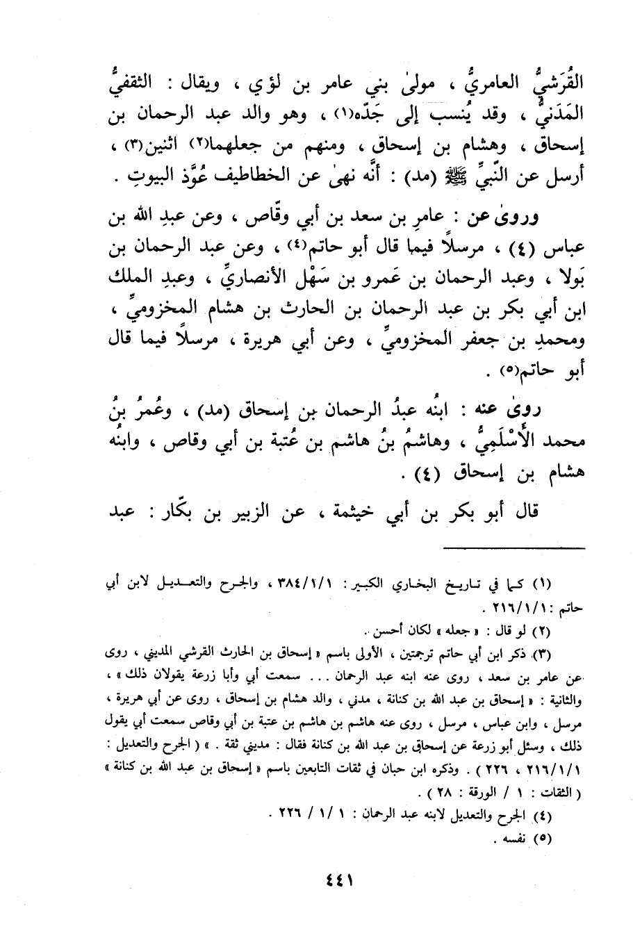 (3) ذكر ابن أَبي حاتم ترجمتين، الاولى باسم"إسحاق بن الحارث القرشي المديني، روى عن عامر بن سعد، روى عنه ابنه عَبْد الرحمن..سمعت أبي وأبا زرعة يقولان ذلك"، والثانية: إسحاق بْن عَبد الله بْن كنانة، مدني، والد هشام بن إسحاق، روى عَن أبي هُرَيْرة، مرسل، وابن عباس، مرسل، روى عنه هاشم بْن هاشم بْن عتبة بْن أَبي وقاص سمعت أبي يقول ذلك، وسئل أبو زُرْعَة عَن إسحاق بْن عَبد الله بْن كنانة فَقَالَ: مديني ثقة.