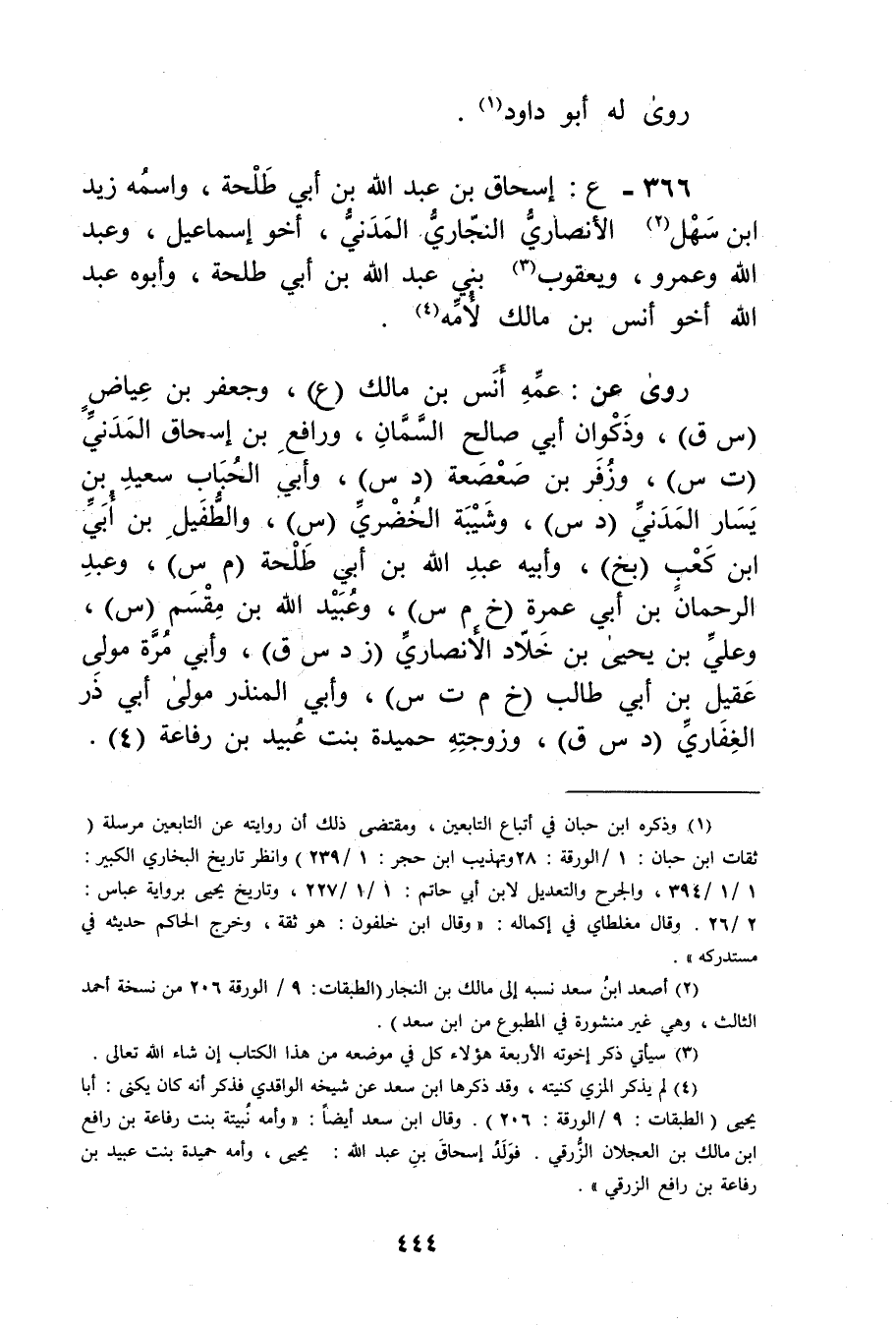 366 - ع: إسحاق بن عَبد الله بْن أَبي طلحة، واسمه زيد ابن سهل (2) الأَنْصارِيّ النجاري المدني، أخو إِسْمَاعِيل، وعبد الله وعَمْرو، ويعقوب (3) بني عَبد الله بْن أَبي طلحة، وأبوه عَبْد الله أخو أنس بْن مالك لأمه (4) .