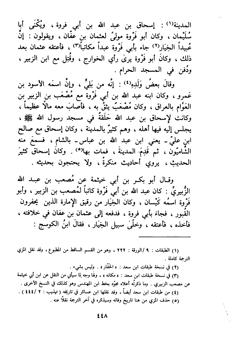 وَقَال بعض ولده (4) : إنه من بلي، وان اسمه الأسود بْن عَمْرو، وكان ابنه عَبد الله بْن أَبي فروة مع مصعب بْن الزبير بْن العوام بالعراق، وكان مصعب يثق به، فأصاب معه مالا عظيما، وكانت لإسحاق بن عَبد الله خلقة في مسجد رَسُول اللَّهِ صَلَّى اللَّهُ عليه وسلم، يجلس إليه فيها أهله، وهم كثير بالمدينة، وكان إسحاق مع صالح ابن علي، يَعْنِي ابْن عَبد اللَّهِ بْن عباس - بالشام، فسمع منه الشاميون، ثم قدم المدينة، فمات بها (5) .