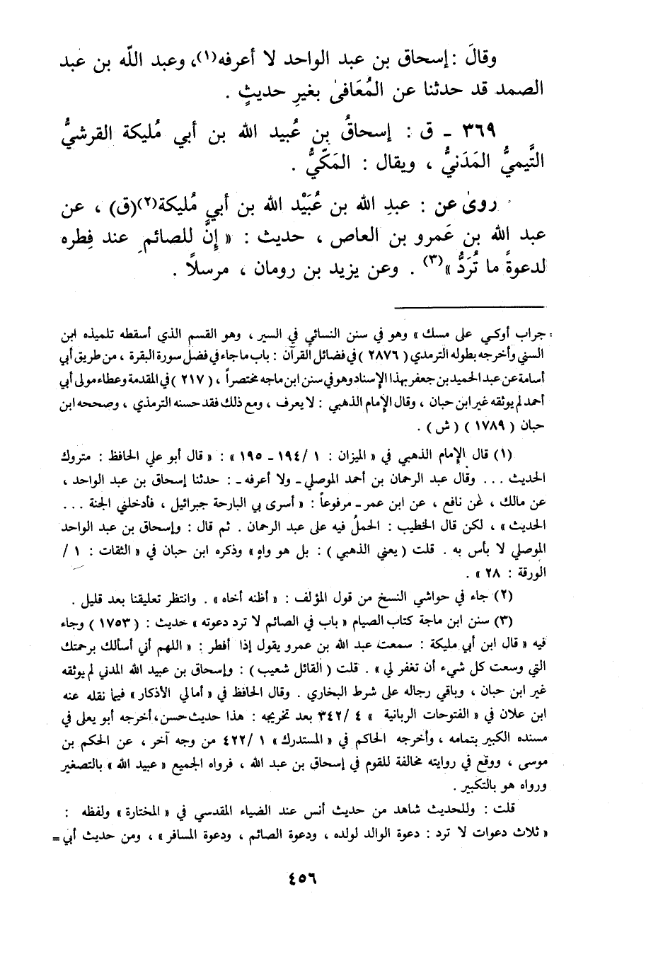 369- ق: إسحاق بن عُبَيد الله بن أَبي مليكة القرشي التَّيْمِيّ المدني، ويُقال: المكي.