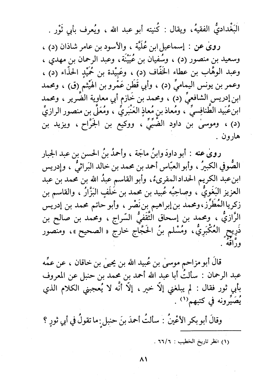 البغدادي الفقيه، ويُقال: كنيته أبو عَبْد الله، ويعرف بأبي ثور.