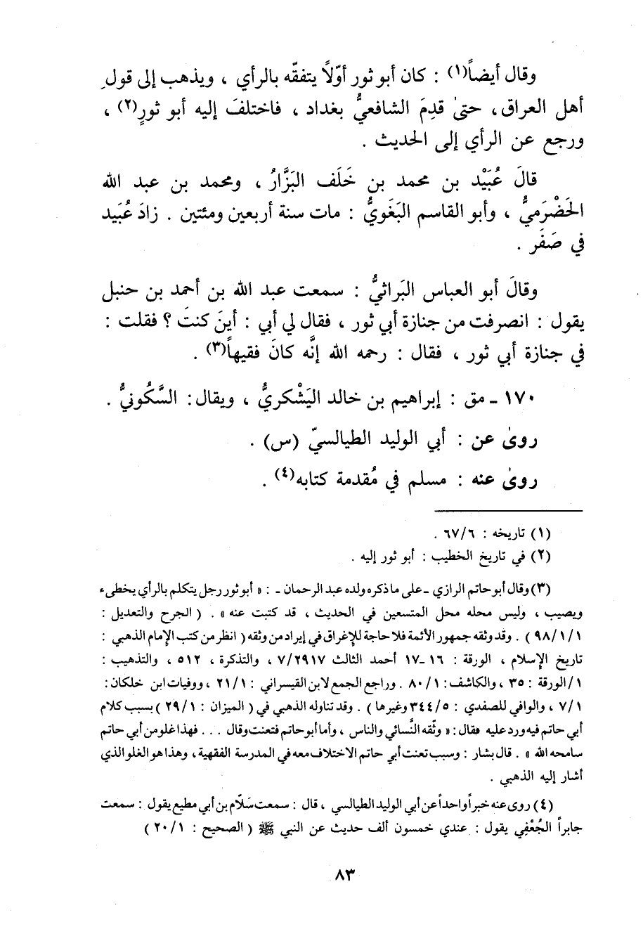 وَقَال أيضا (1) : كان أبو ثور أولا يتفقه بالرأي، ويذهب إلى قول أهل العراق، حتى قدم الشافعي بغداد، فاختلف إليه أبو ثور (2) ، ورجع عَن الرأي إلى الحديث.