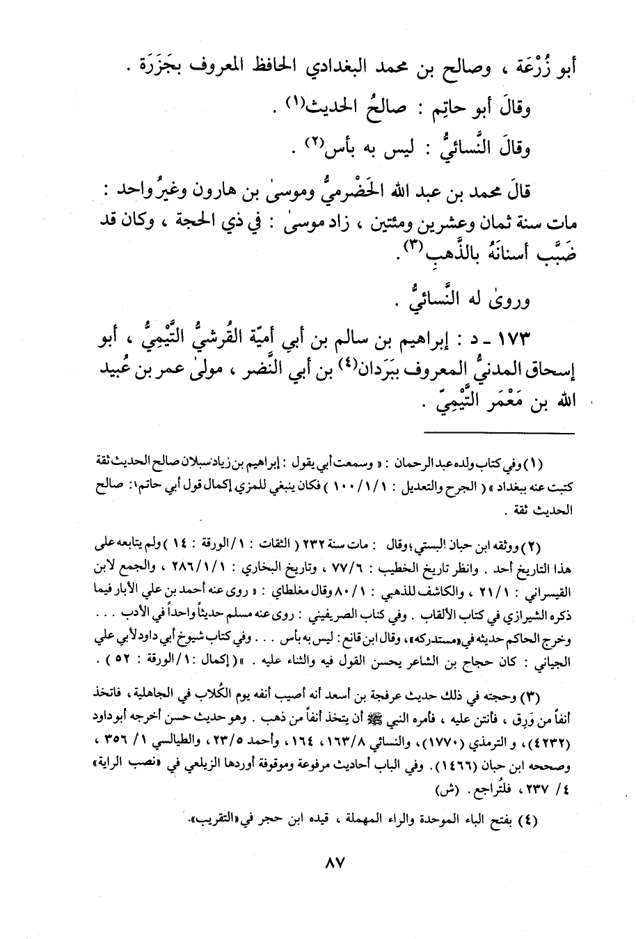 (1) وفي كتاب ولده عبد الرحمن: وسمعت أبي يقول: إبراهيم بن زياد سيلان صالح الحديث ثقة كتبت عنه ببغداد" (الجرح والتعديل: 1 / 1 / 100) فكان ينبغي للمزي إكمال قول أبي حاتم: صالح الحديث ثقة.