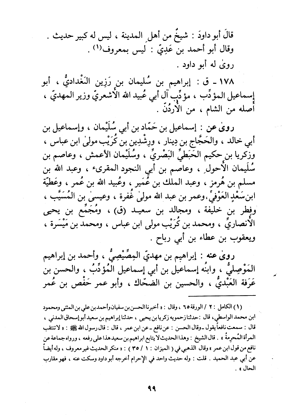 (1) الكامل: 2 / الورقة 65، وَقَال: أخبرنا الحسن بن سفيان وأَحْمَد بْن علي بْن المثنى ومحمود ابن محمد الواسطي، قال: حَدَّثَنَا زحمويه زكريا بن يحيى، حَدَّثَنَا إِبْرَاهِيم بن سَعِيد أبو إسحاق المدني، قال: سمعت نافعا يقول: وَقَال الحسن: عَنْ نَافِع، عَن ابْن عُمَر، قال: قال رَسُولُ اللَّهِ صلى الله عليه وسلم: لا تنتقب المرأة المحرمة". قال الشيخ: وهذا الحديث لا يتابع ابراهيم بن سَعِيد هذا على رفعه، ورواه جماعة عن نافع من قول ابن عُمَر"وَقَال الذهبي في (الميزان: 1 / 35) : منكر الحديث غير معروف، وله أيضا عَن أبي عبد الحميد. قلت: وله حديث واحد في الاحرام أخرجه أبو داود وسكت عنه، فهو مقارب الحال".