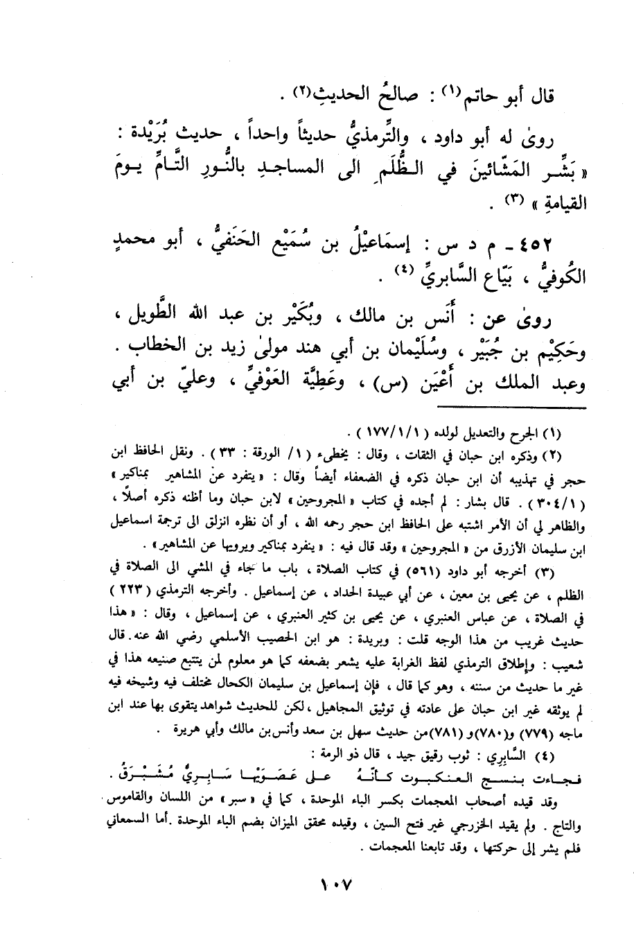 (452) - م د س: إِسْمَاعِيل بن سميع الحنفي، أَبُو مُحَمَّد الكوفي، بياع السابري (4) .