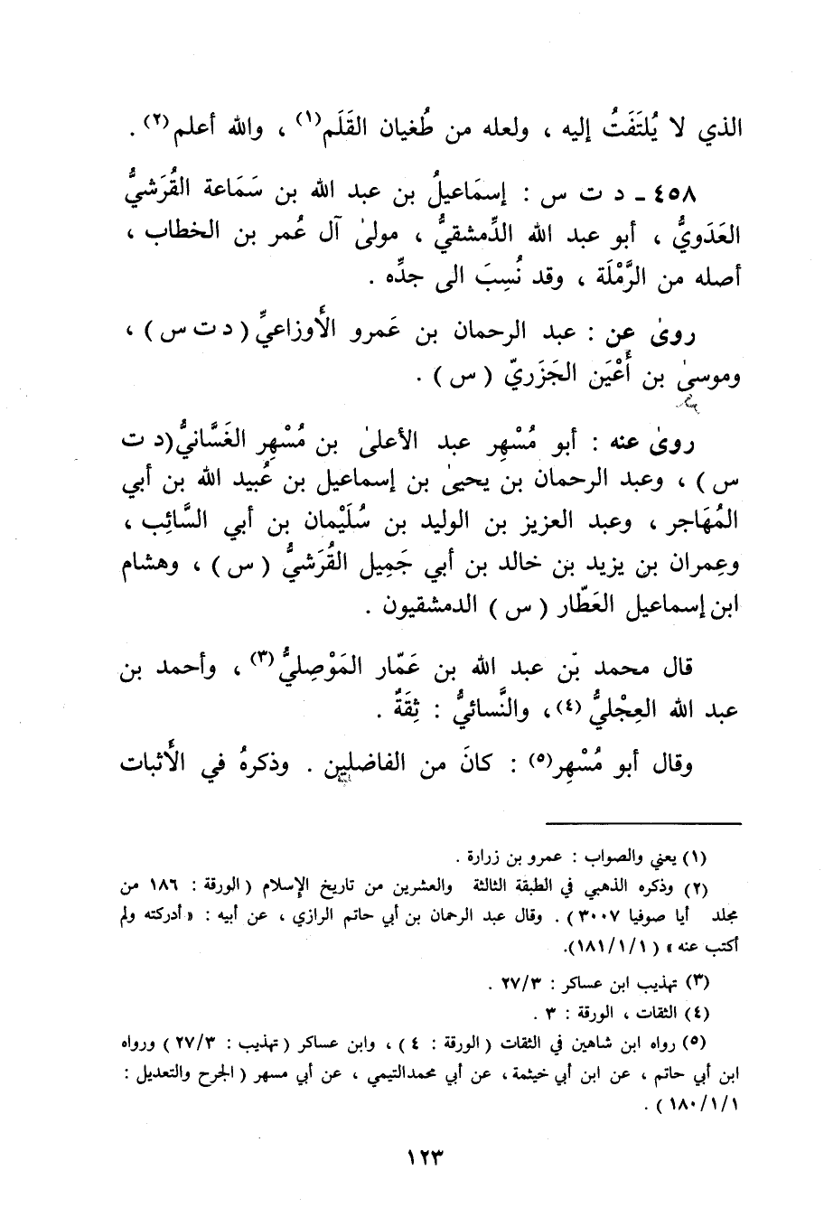 (5) رواه ابن شاهين في الثقات (الورقة: 4) ، وابن عساكر (تهذيب: 3 / 27) ورواه ابن أَبي حاتم، عن ابن أَبي خيثمة، عَن أبي مُحَمَّد التَّيْمِيّ، عَن أبي مسهر (الجرح والتعديل: 1 / 1 / 180) .