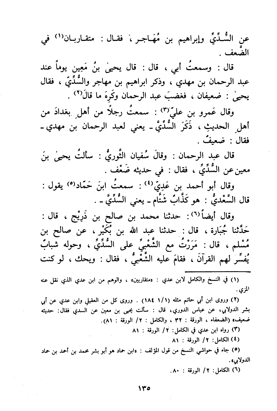 (2) وروى ابن أَبي حاتم مثله (1 / 1 / 184) . وروى كل من العقيلي وابن عدي عَن أَبِي بشر الدولابي، عن عباس الدوري، قال: سألت يحيى بْن مَعِين عن السدي فقال: حديثه ضعيف" (الضعفاء، الورقة: 32، والكامل: 2 / الورقة: 81) .