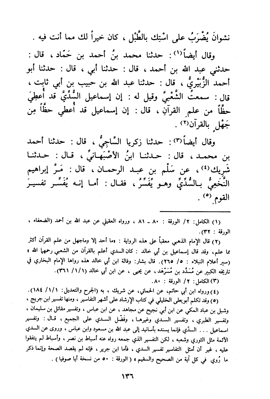 (2) قال الإمام الذهبي معقبا على هذه الرواية: ما أحد إلا وما جهل من علم القرآن أكثر مما علم، وقد قال إِسْمَاعِيل بْن أَبي خَالِد: كان السدي أعلم بالقرآن من الشعبي رحمهما الله" (سير أعلام النبلاء: 5 / 265) . قال بشار: وَقَالة ابن أَبي خالد هذه رواها الإمام البخاري في تاريخه الكبير عن مسدد بن مسرهد، عن يحيى، عن ابن أَبي خالد (1 / 1 / 361) .