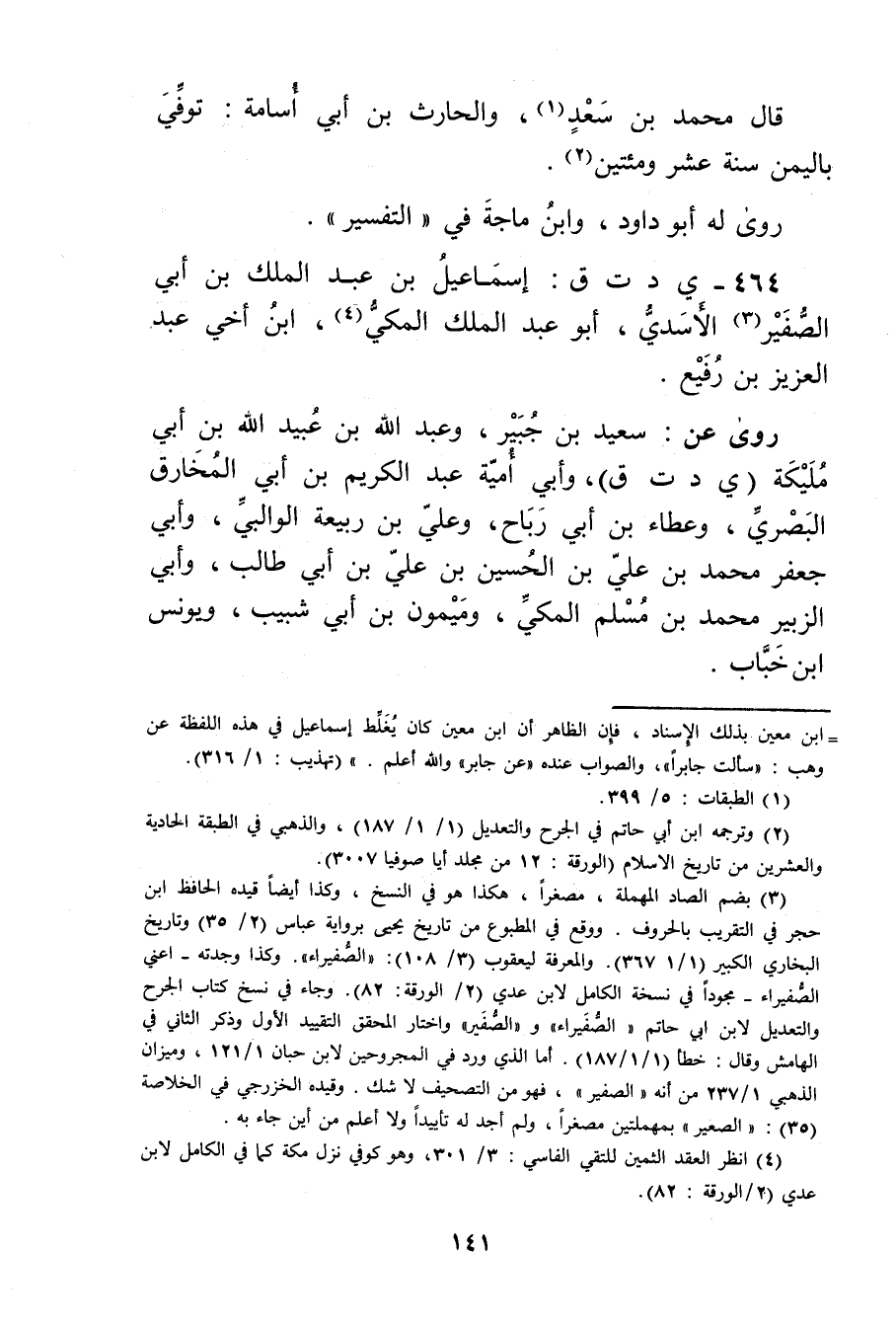 وجاء في نسخ كتاب الجرح والتعديل لابن أَبي تم"الصفيراء"و"الصفير"واختار المحقق التقييد الاول وذكر الثاني في الهامش وَقَال: خطأ (1 / 1 / 187) .أما الذي ورد في المجروحين لابن حبان 1 / 121، وميزان الذهبي 1 / 237 من أنه"الصفير"، فهو من التصحيف لا شك. وقيده الخزرجي في الخلاصة (3) : الصعير"بمهملتين مصغرا، ولم أجد له تأييدا ولا أعلم من أين جاء به.