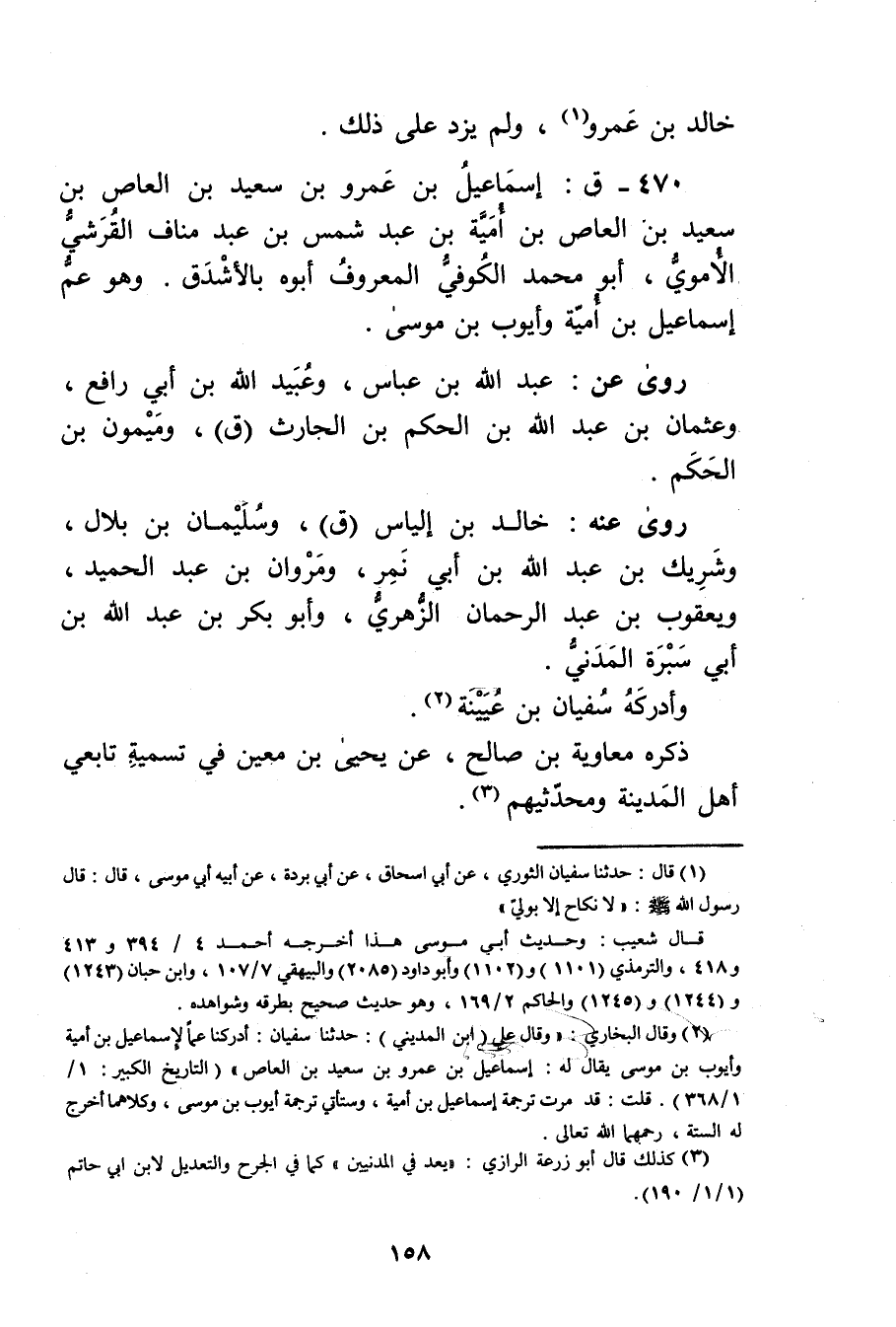 (2) وقَال البُخارِيُّ: وَقَال علي (ابن المديني) : حَدَّثَنَا سفيان: أدركنا عما لإِسماعيل بْن أمية وأيوب بْن موسى يقال له: إِسْمَاعِيل بن عَمْرو بن سَعِيد بن العاص" (التاريخ الكبير: 1 / 1 / 368) . قلت: قد مرت ترجمة إسماعيل بن أميه، وستأتي ترجمة أيوب بن موسى، وكلاهما أخرج له الستة، رحمهما الله تعالى.